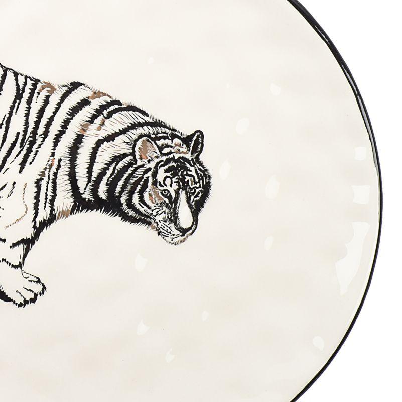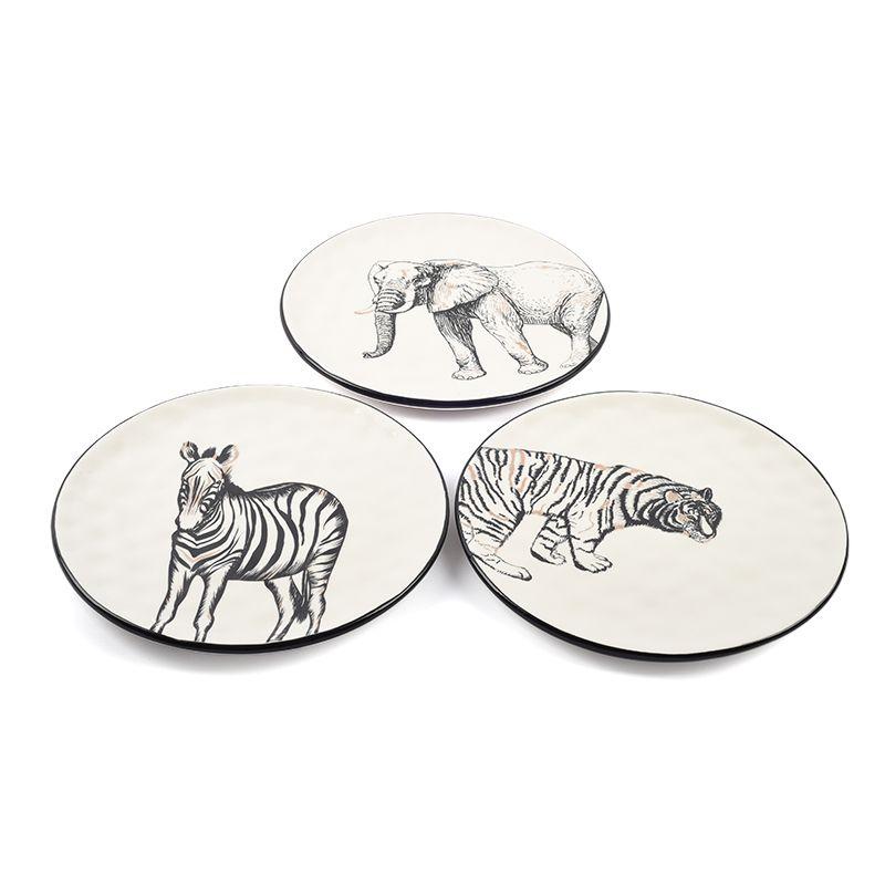 В набор входят три тарелки с изображениями зебры, тигра и слона. Фон посуды имеет приятный молочный оттенок. В контрастный черный рисунок добавлены фрагменты песочного цвета, которые придают мягкость четкой литографии. Окантовка по краю посуды выделяет ее в сервировочном комплекте, такие тарелки вы можете поставить на однотонные подставные блюда – в любом случае они будут выглядеть эффектно. В коллекции Masai представлены также десертные тарелки и блюда разных форм и размеров.