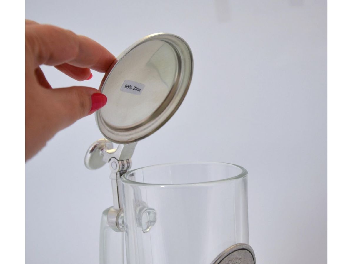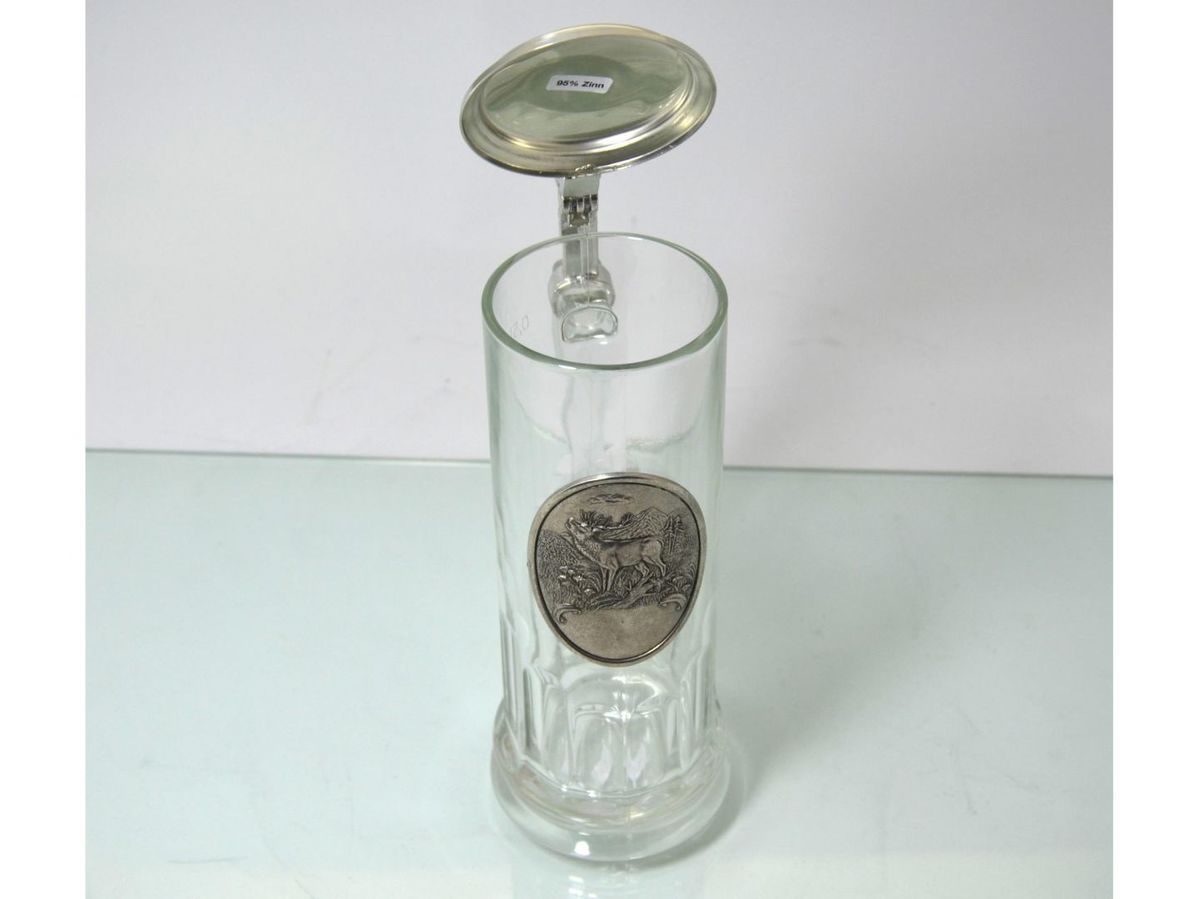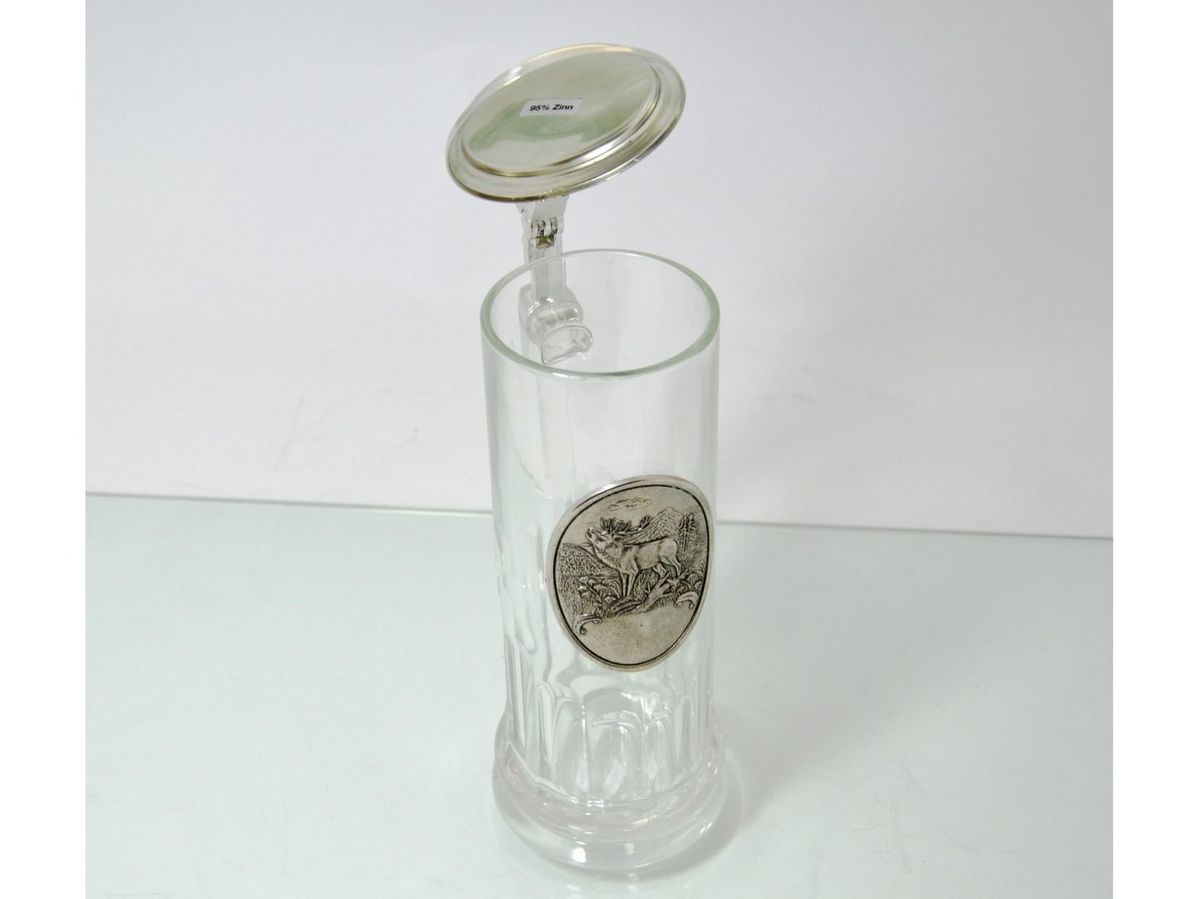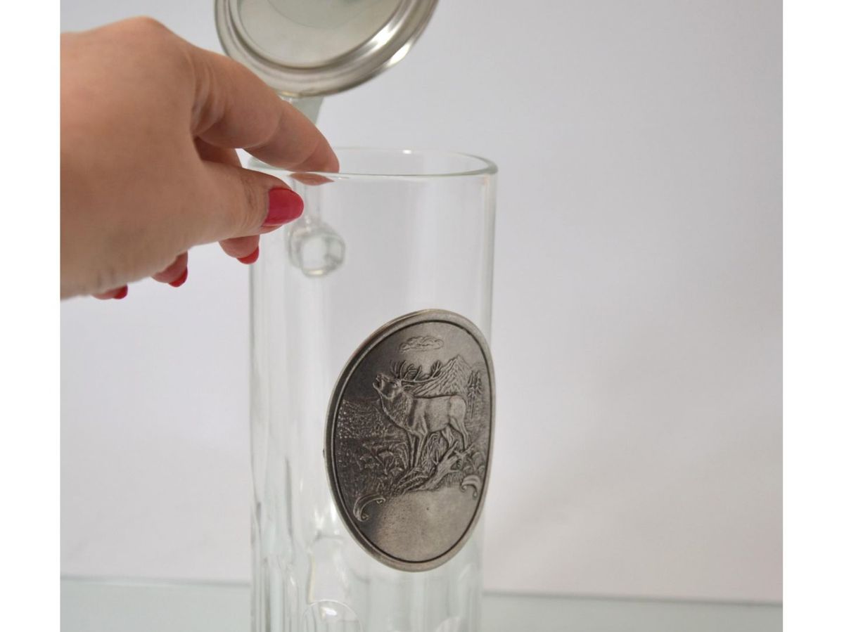 Корпус кружки прикрашений напівпрозорим гравірованим малюнком із зображенням медведя та лось. Масивна кришка з олова з барельєфним зображенням Олень.