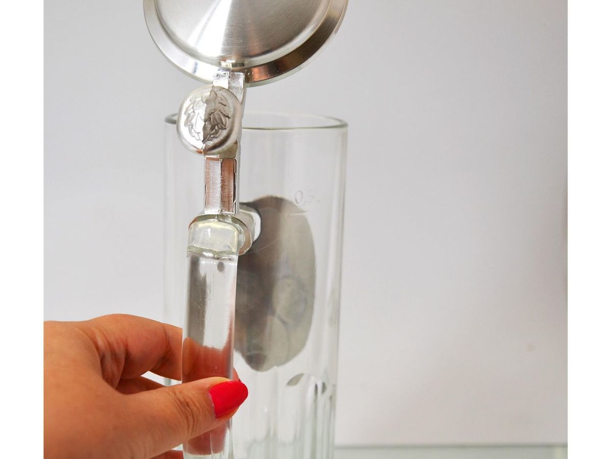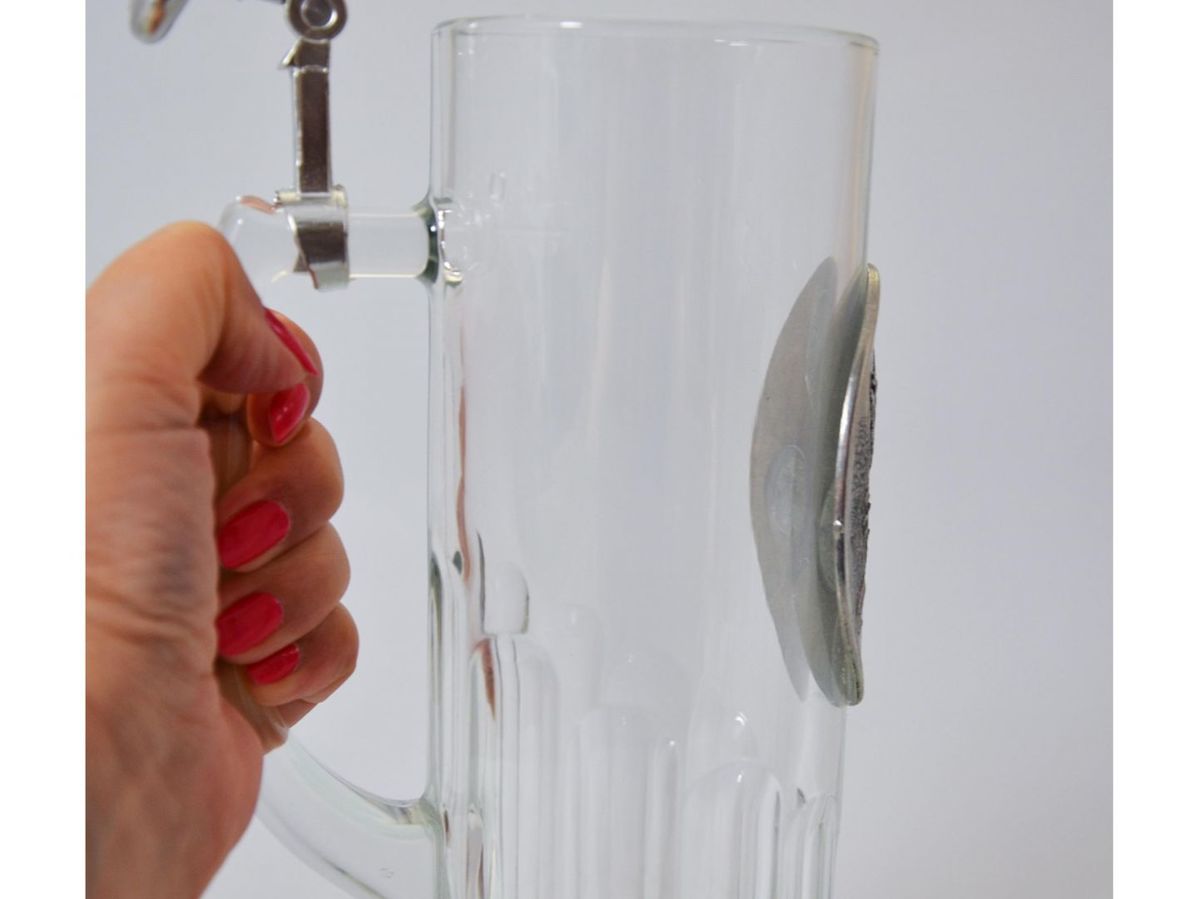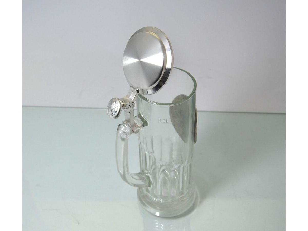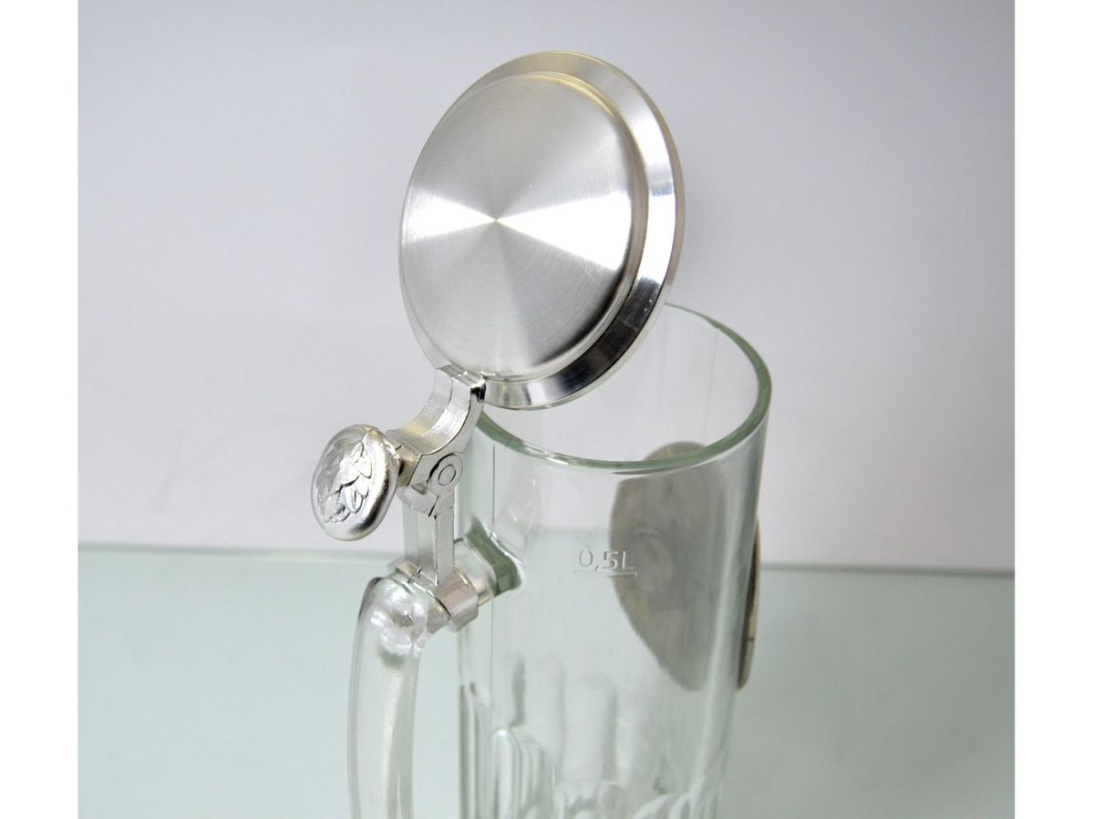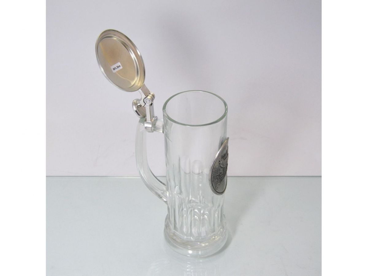 Корпус кружки прикрашений напівпрозорим гравірованим малюнком із зображенням медведя та лось. Масивна кришка з олова з барельєфним зображенням Олень.