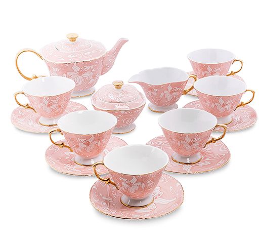 Этот красивый чайный сервиз на шесть персон – чашки с блюдечками, чайник для заварки, молочник и сахарница выполнены из тончайшего фарфора. Снаружи все предметы сервиз окрашены в розовый цвет, по которому повторяются белые узоры на цветочную тематику.