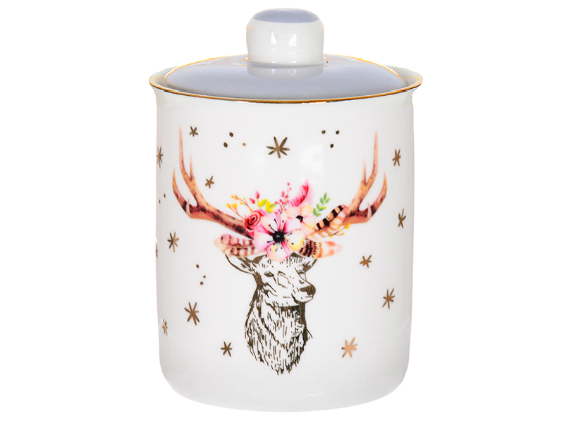 Банка для зберігання фарфорова «Різдвяний Олень» 9,5 см — це стильний і практичний аксесуар, який стане окрасою вашої кухні чи вітальні. На білосніжній поверхні зображений елегантний олень із витонченими рогами, прикрашеними квітами та пір’ям, що створює святковий настрій і додає відчуття затишку.