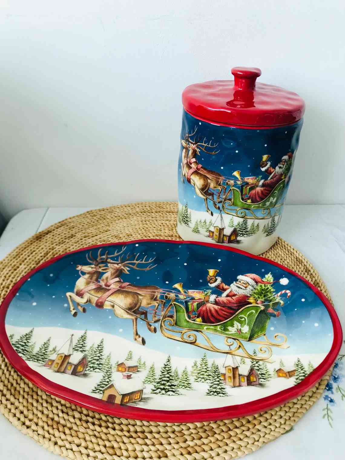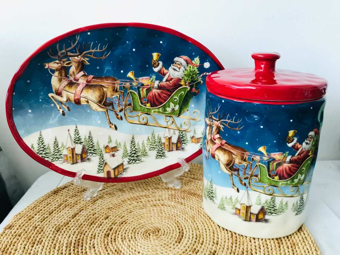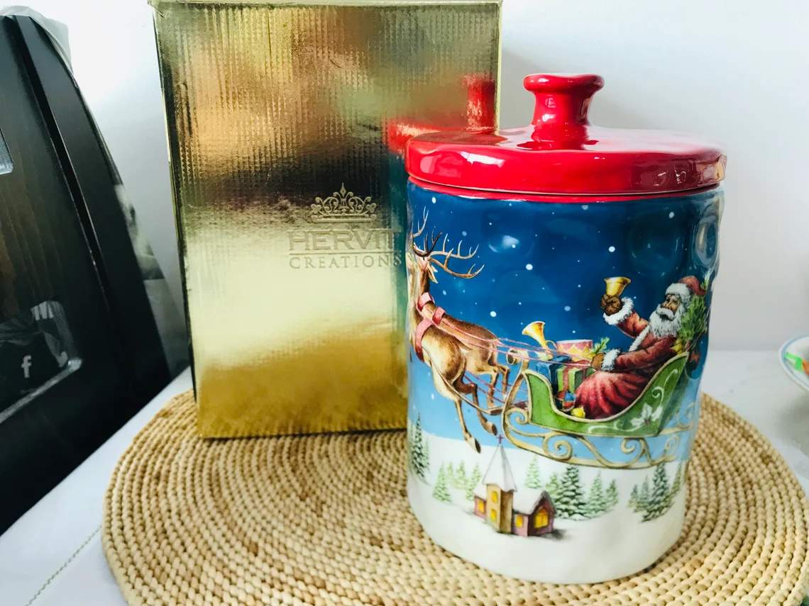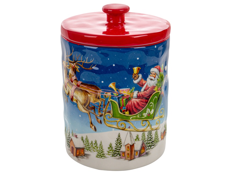 Создайте атмосферу праздника на кухне с помощью этой керамической банки объёмом 1,8 л. На её поверхности изображена жизнерадостная сцена: Дед Мороз в санях, запряжённых оленями, мчится по зимнему небу над уютной заснеженной деревней. Яркие краски и тщательно прорисованные детали делают банку по-настоящему праздничной и нарядной.