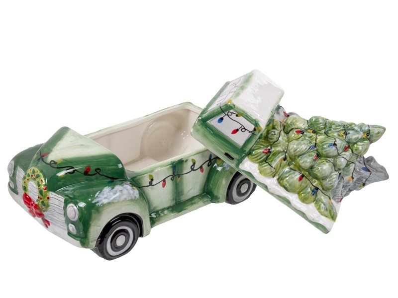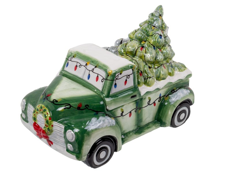 Ця банка для печива у формі новорічної машини — справжня окраса вашої кухні! Зелений ретро-вантажівка зі святковим вінком на капоті та гірляндою вогників миттєво створює атмосферу зимової казки. У кузові красується пишна ялинка, готова до свята, а кожна деталь розписана з любов’ю, щоб ви відчули затишок і радість наближення Нового року.