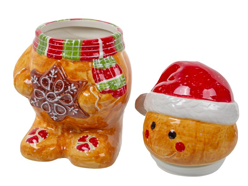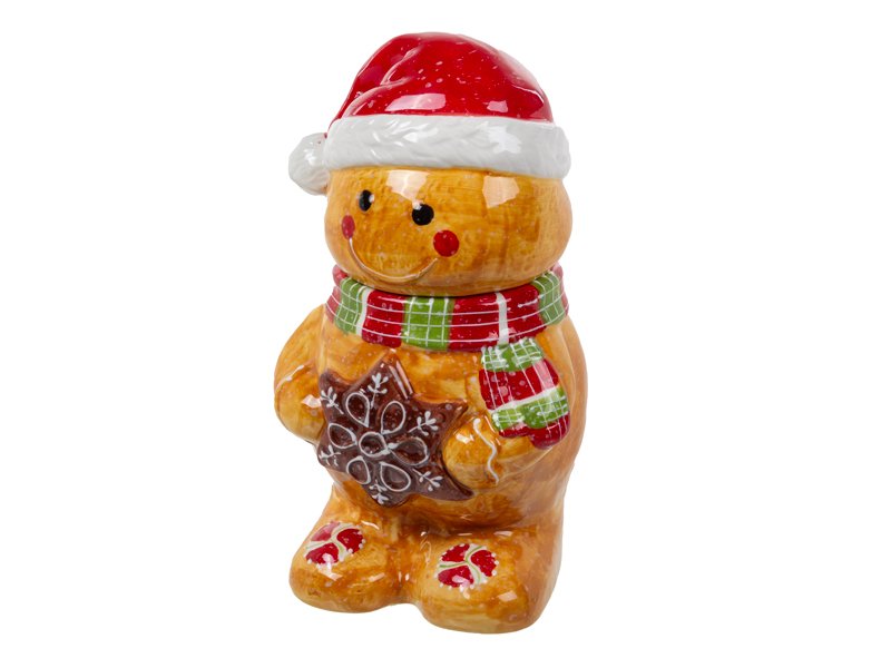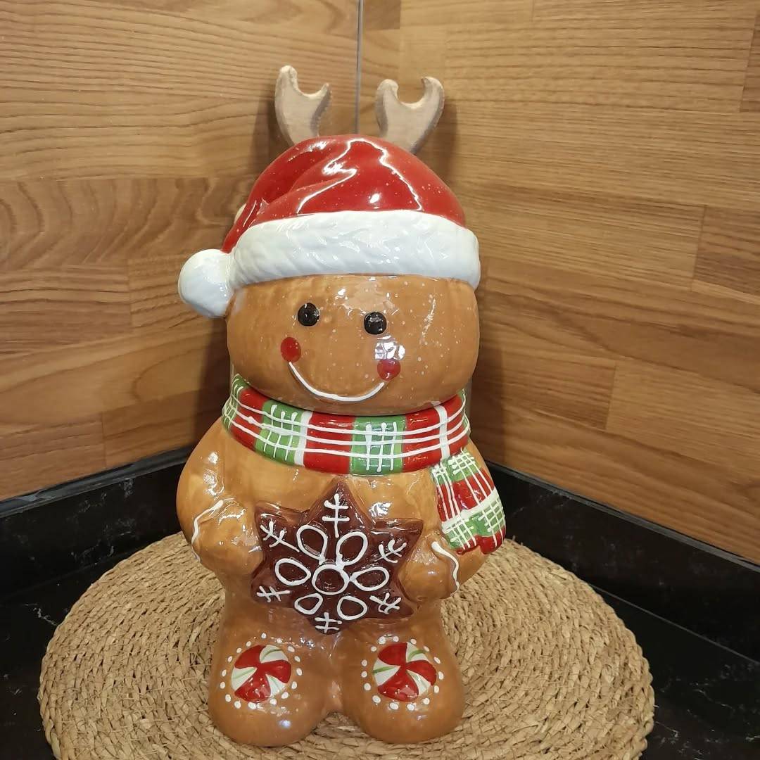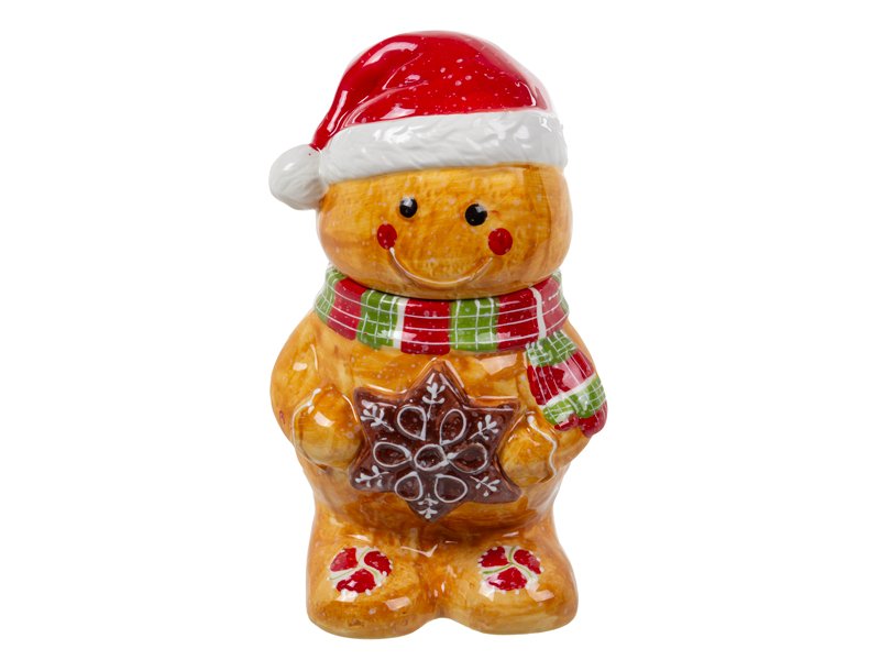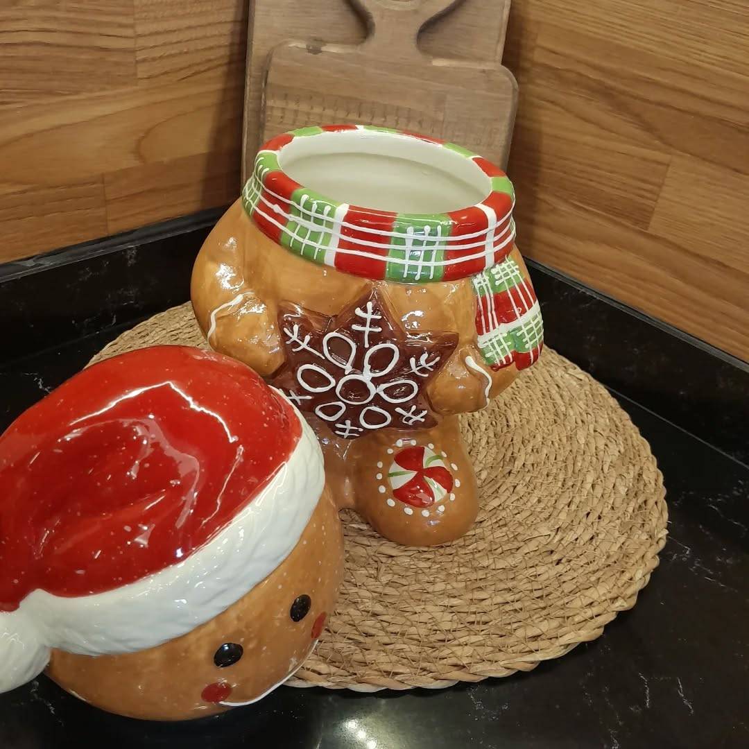 Ця керамічна банка для печива у формі пряникового чоловічка – справжній символ домашнього затишку та святкової радості! Яскрава глазур, червона шапочка Санти та зелений шарф створюють атмосферу Різдва, а весела усмішка викликає бажання усміхнутися у відповідь. Банка виготовлена з якісної кераміки, стійка й надійна, ідеально підходить для зберігання печива, цукерок чи пряників.
