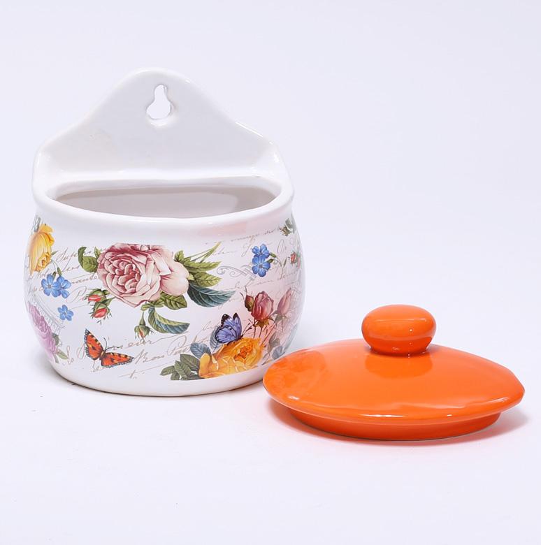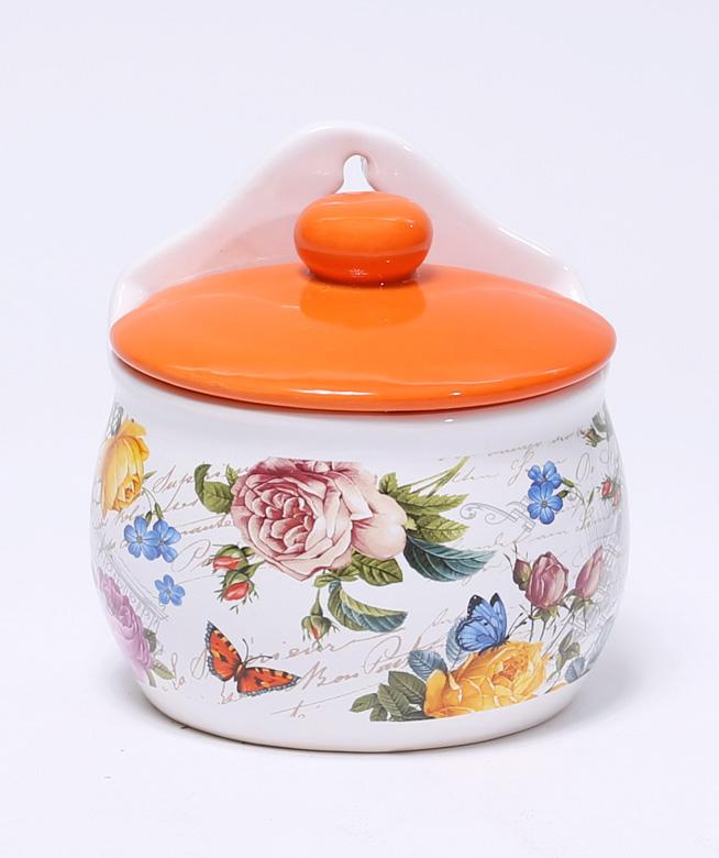 Банка Літо в Європі 380мл для продуктів із яскраво-оранжевою кришкою. Виготовлена з легкої кераміки (доломіту). Підходить для зберігання сипких продуктів (сіль, цукор, спеції) або різноманітних кухонних дрібниць. Задня частина баночки плоска з петлею для навішування. Яскравий теплий квітковий малюнок банки додасть затишку на Вашій кухні та прикрасить її. Розмір 19х11см, висота 12 см. Упакована в ошатну коробку, така баночка стане чудовим подарунком.