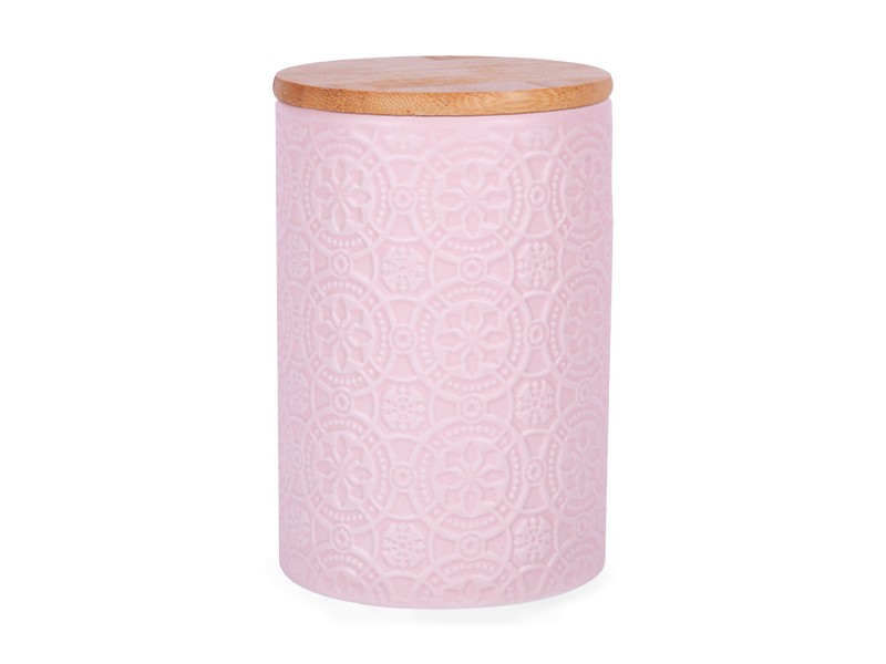 Ця банка для сипучих продуктів з бамбуковою кришкою стане не лише практичним помічником на вашій кухні, а й стильним елементом декору. Вона виготовлена з міцної кераміки, прикрашена ніжним рожевим відтінком та оригінальним рельєфним візерунком, що надає виробу вишуканого й затишного вигляду. Завдяки універсальному дизайну банка гармонійно впишеться в будь-який інтер’єр і підкреслить вашу турботу про красу та порядок.