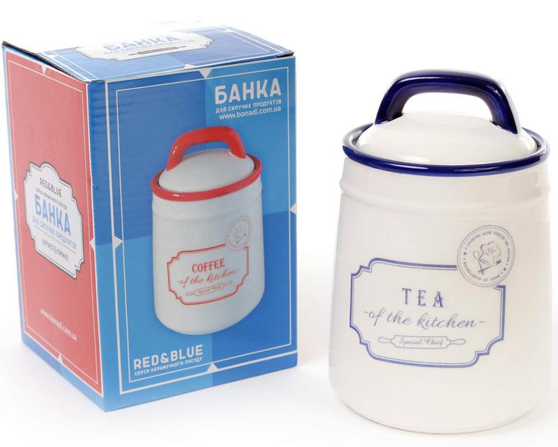 Кухонная керамическая банка Red&Blue TEA (емкость для листового чая) с крышкой - красивая и функциональная посуда, современное оригинальное украшение Вашего дома. Объем 800мл, Ø11.4см, высота 16.8см. Изготовлена из керамики - безопасного материала даже для длительного хранения сыпучих продуктов. Синий декор с надписями: TEA of the kitchen и Special Chief. Упакована в цветную принт-коробку.