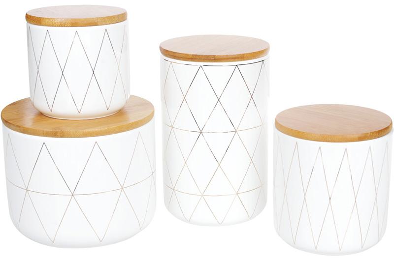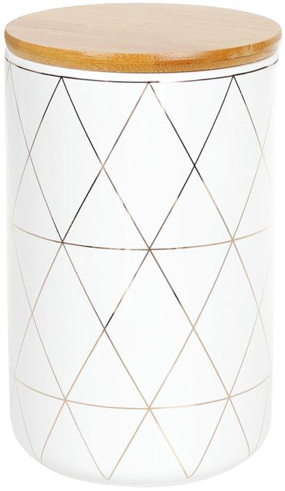 Керамічна банка Merceyl Золоті Ромби для зберігання сипучих продуктів, круп, прянощів та різних спецій. Місткість з білої кераміки з декором золоті ромби. Об'єм 850мл. Натуральна бамбукова кришка. Розмір: 10х10х16см.