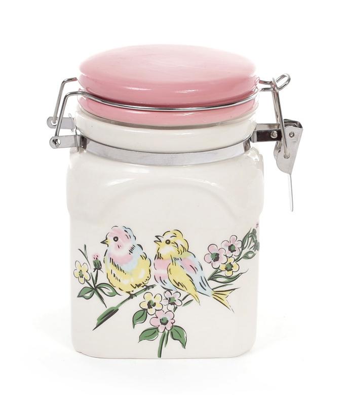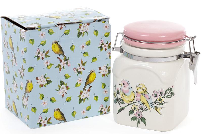 Банка керамічна Весняна трель для сипучих продуктів, Придатна для тривалого зберігання, Гарний посуд для весняного настрою, На кришці встановлена металева кліпса (засувка) для щільного закривання, Об'єм ємності 350мл, Молочна глазур з гілкою квітучої сакури та птаха рожева, 5х7,5х11,5см, Упаковано у фірмову подарункову принт-коробку