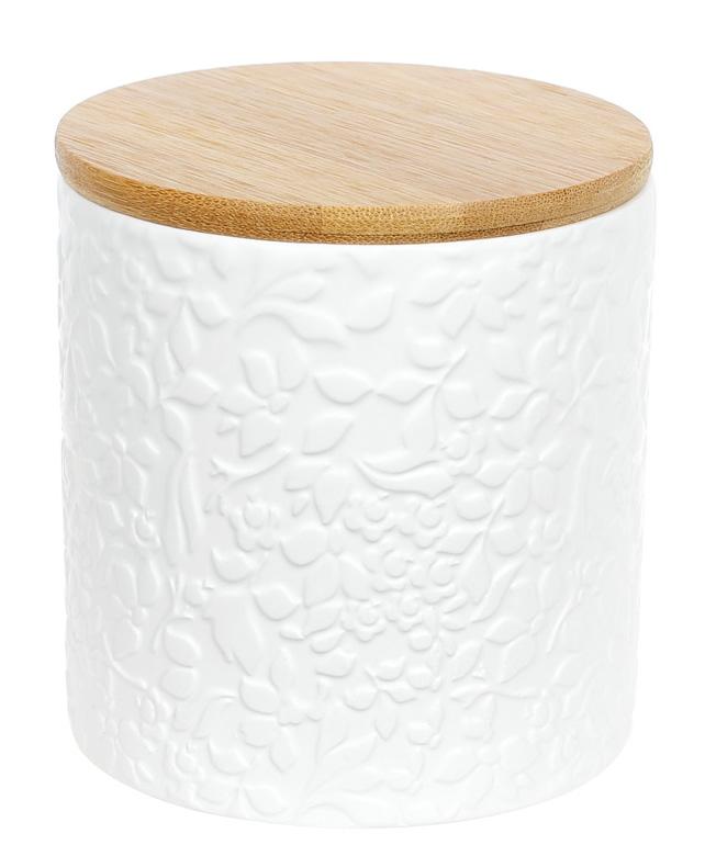 Керамическая банка Merceyl Жасмин для хранения сыпучих продуктов, круп, пряностей и различных специй. Емкость из белой керамики с фактурным узором цветов жасмина. Объем 550мл. Натуральная бамбуковая крышка. Белая матовая керамика придает необычности дизайну кухонной банки. Размер: 10х10х10.6см.