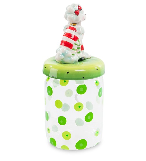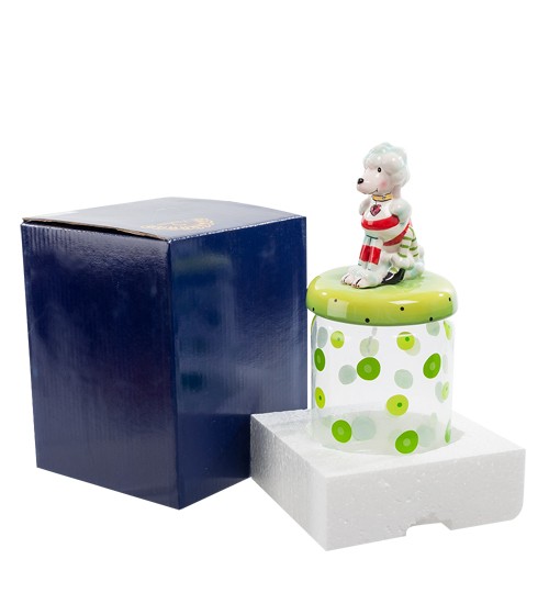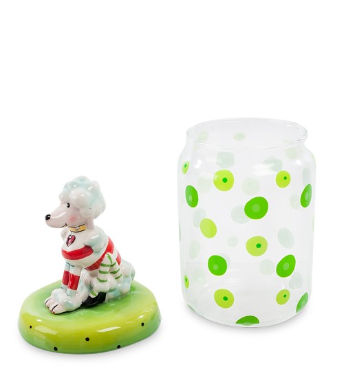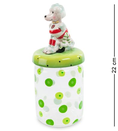 Відмінним прикладом кухонного начиння з душею можна сміливо назвати банку для сипучих "Пудель", яка стане відмінним містким помічником і яскравим красивим предметом декору одночасно. Колірна гамма милої баночки – «циркова», прозоре скло основи прикрашають яскраві зелено-салатові круги, на кришці в дрібну чорну цятку сидить червоно-білий пудель.