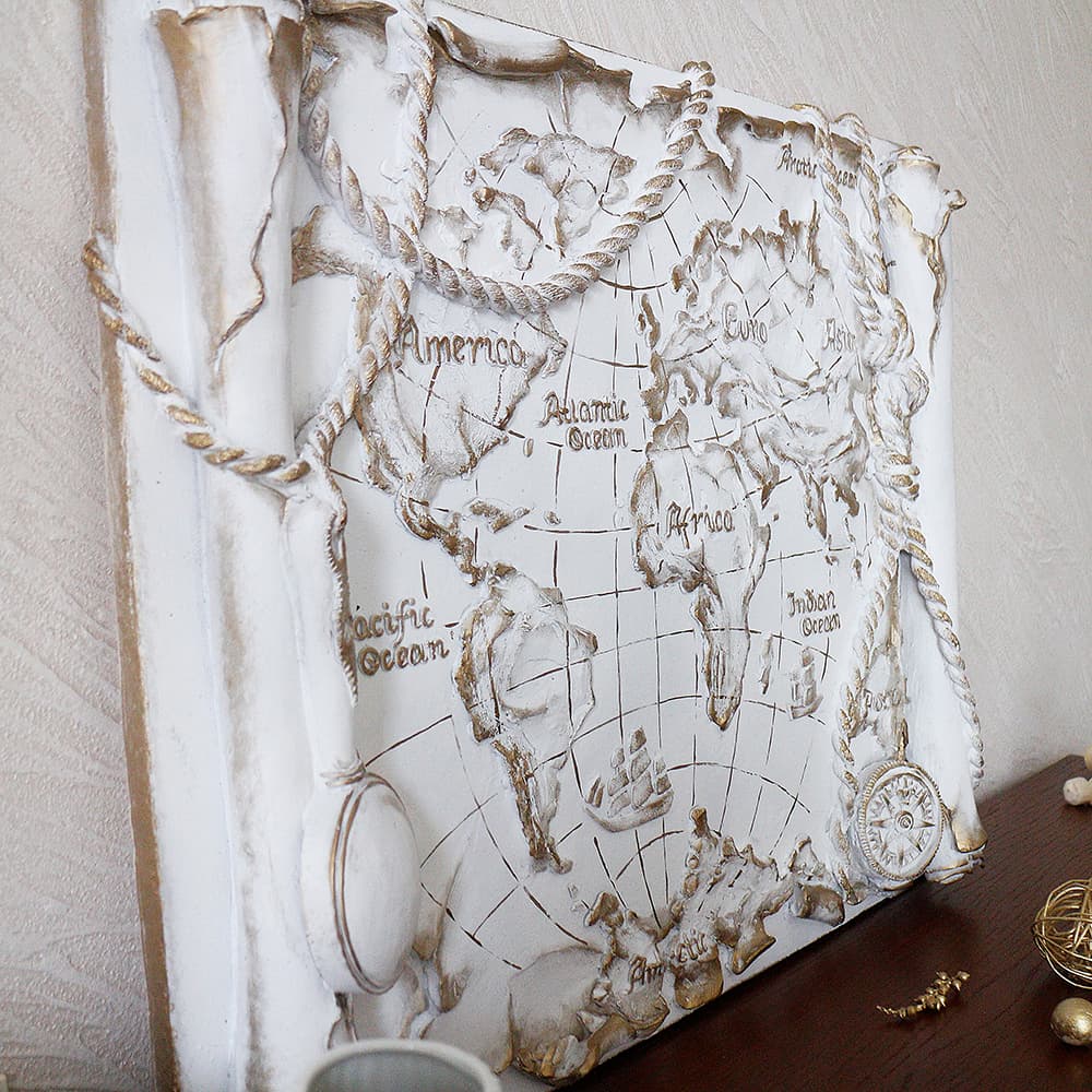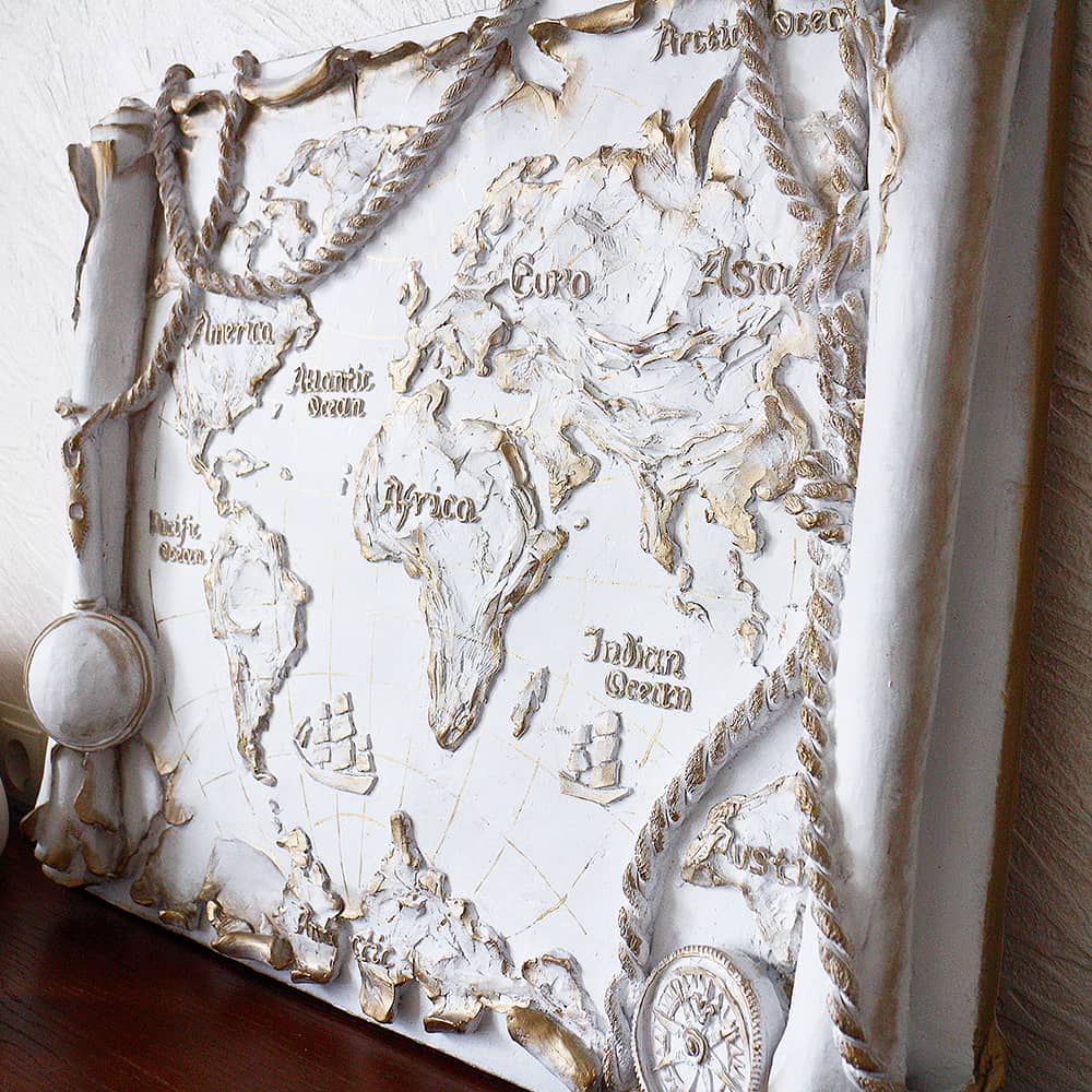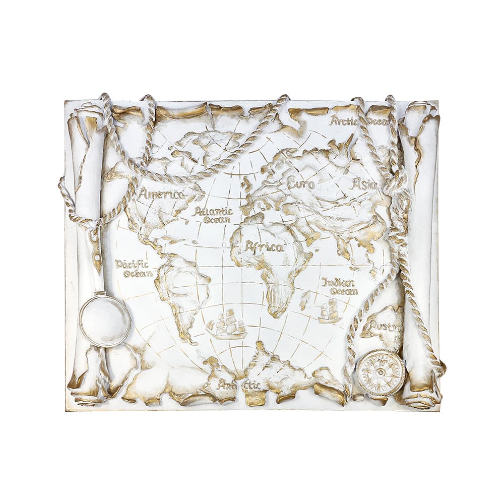 Барельеф белый с золотистым напылением "Карта мира" 52х62 см