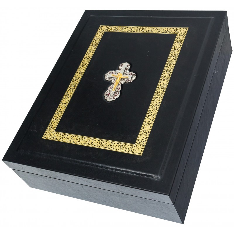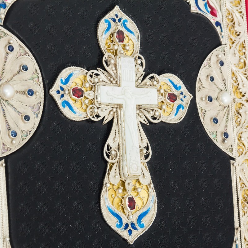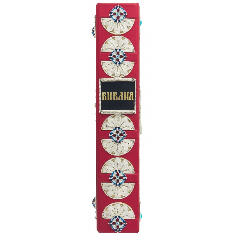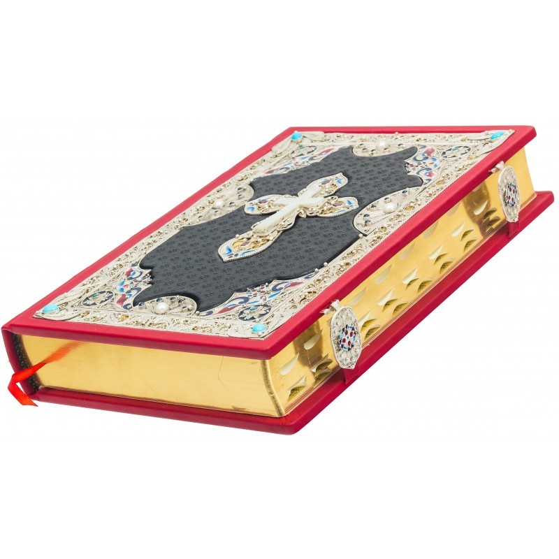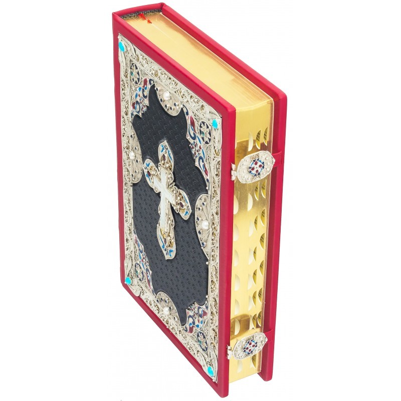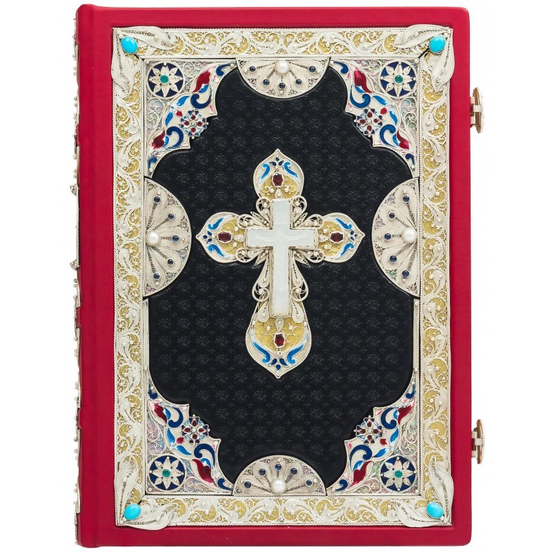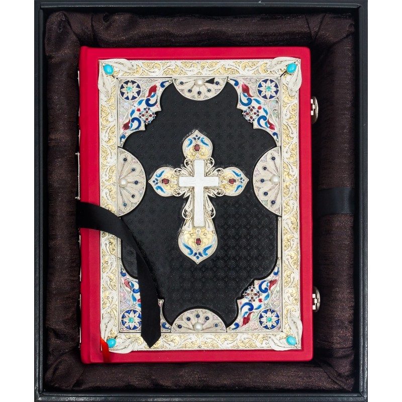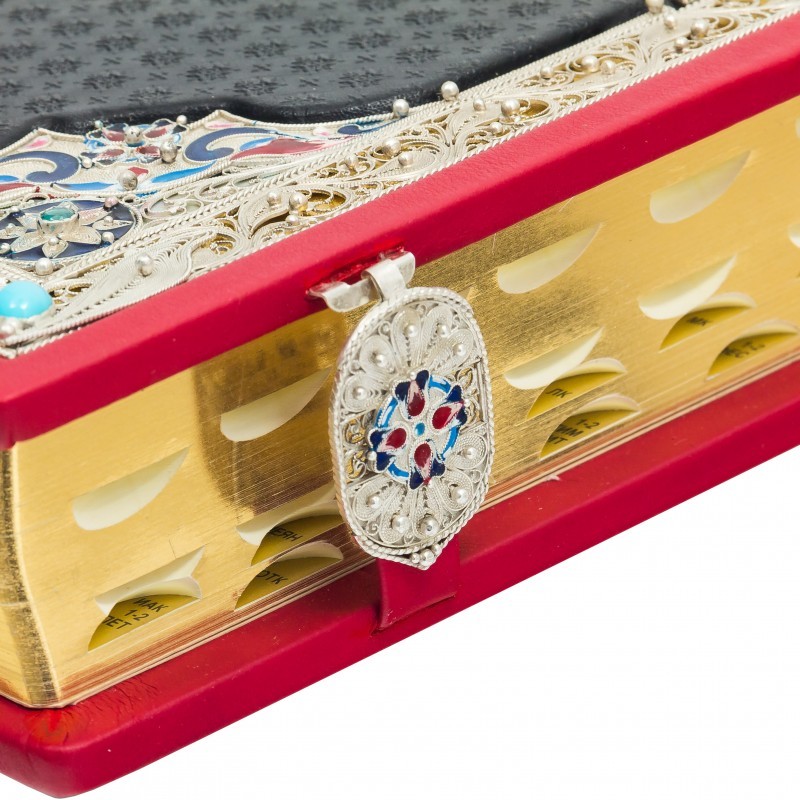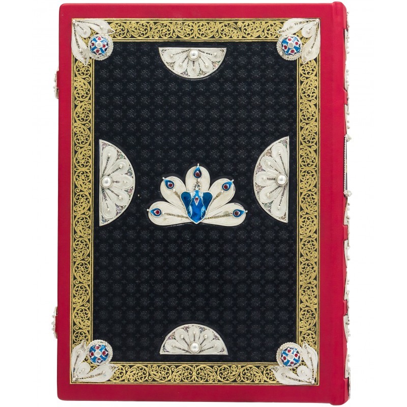 Данная подарочная книга оформлена в переплет из натуральной высококачественной кожи ручной работы. Вся книга украшена красивыми медными накладками, которые покрыты серебром и золотом, а также, по всему периметру, книга украшена качественными стразами. На книге имеются декорации художественной ювелирной эмалью. С боковой части книги есть золотой срез.
