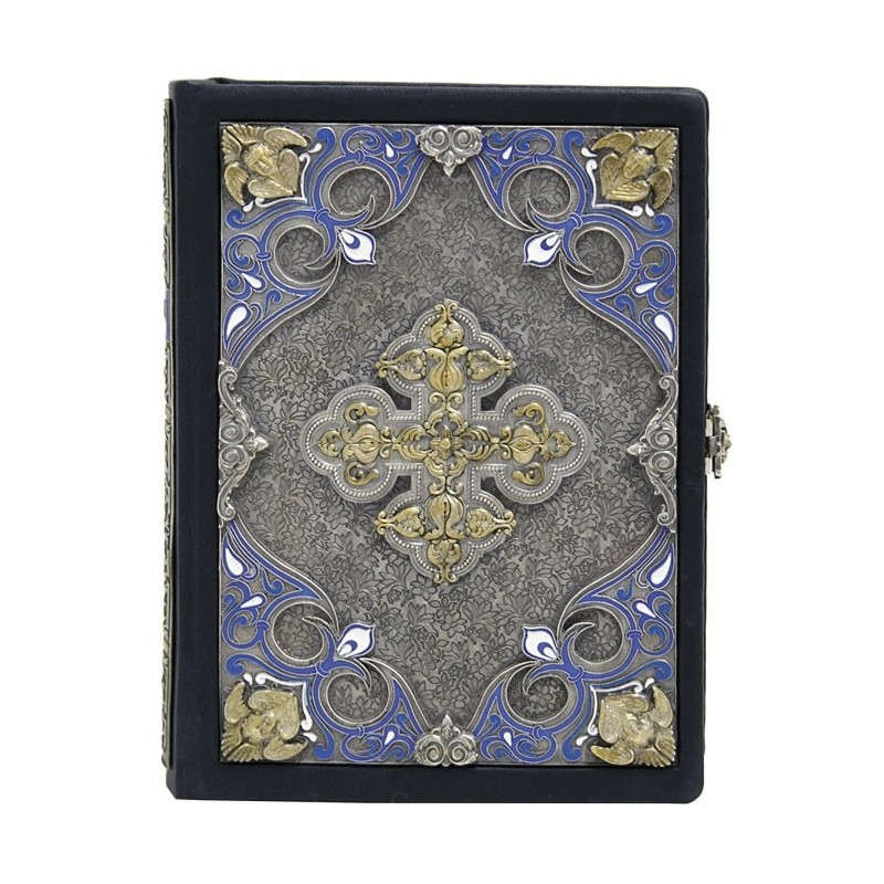 Розкішна цільношкіряна палітурка ручної роботи і мідними накладками з позолотою, сріблом, сканню, емалями.
