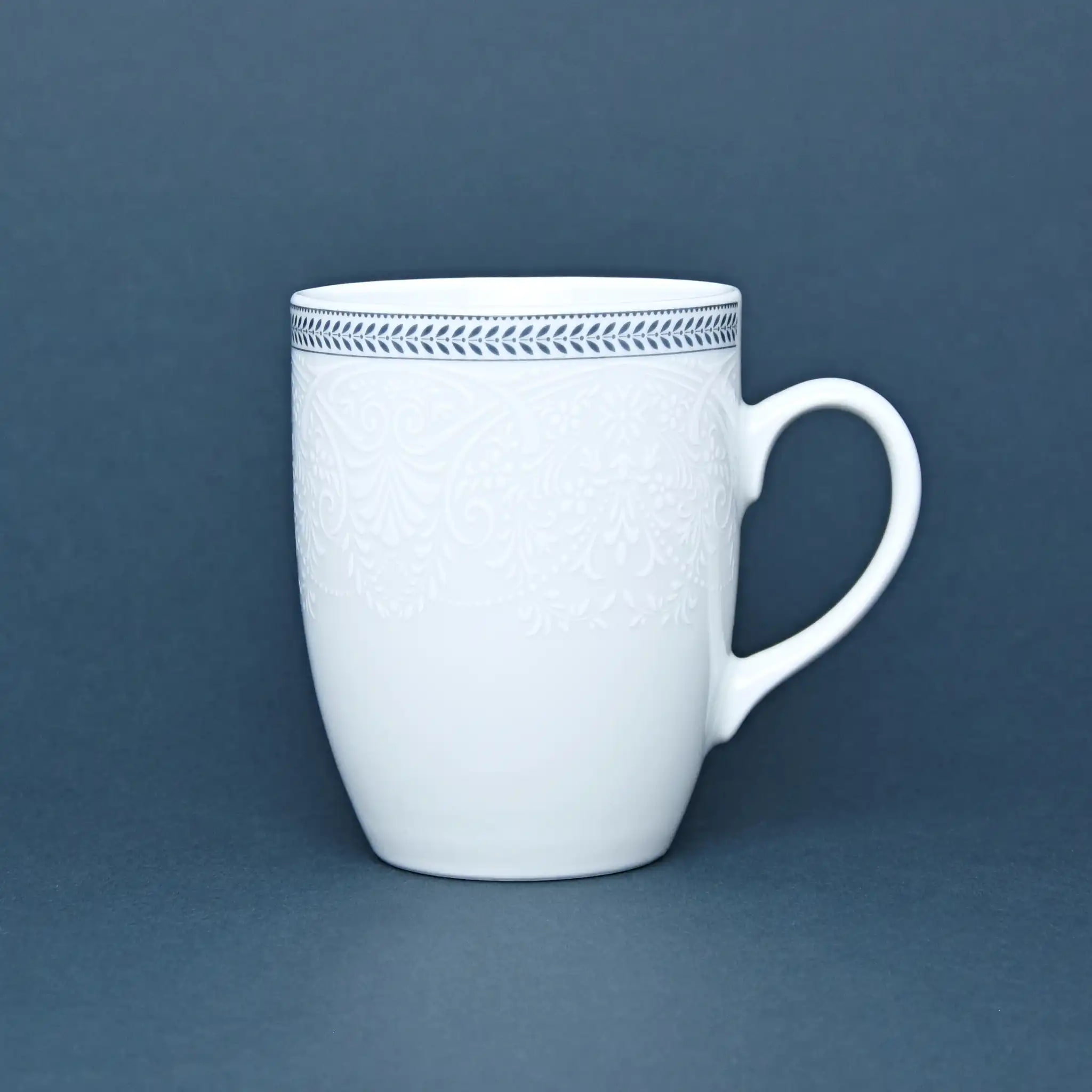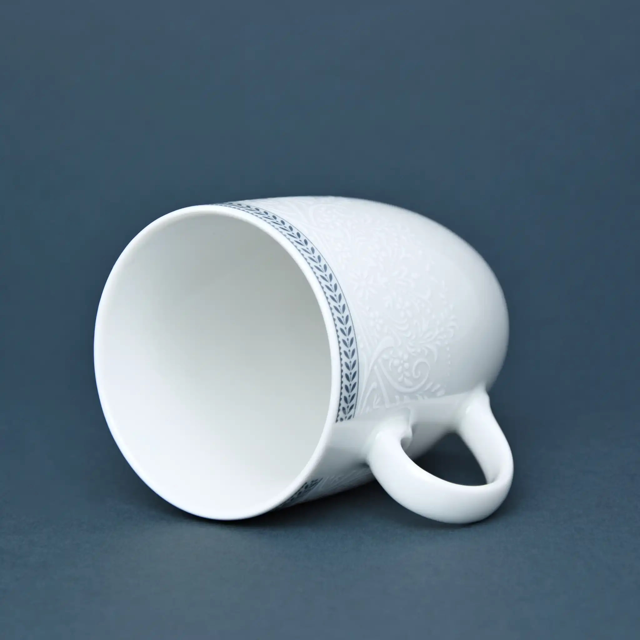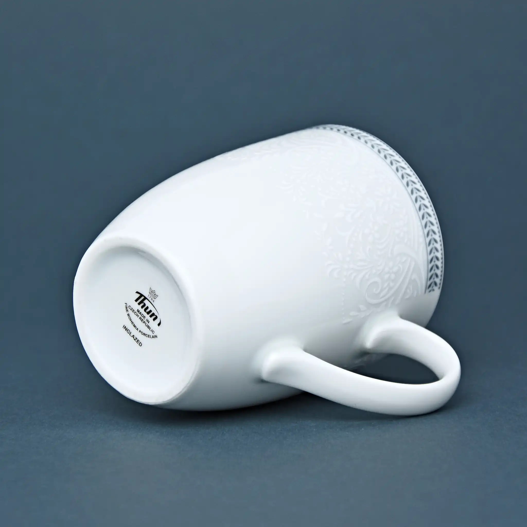 Порцелянова кружка Thun Eva — це поєднання вишуканості, практичності та чеської якості. Білосніжну поверхню прикрашає витончений рельєфний візерунок і тонка сіра облямівка у формі графічного орнаменту. Такий декор виглядає стримано, але додає кружці особливого шику.