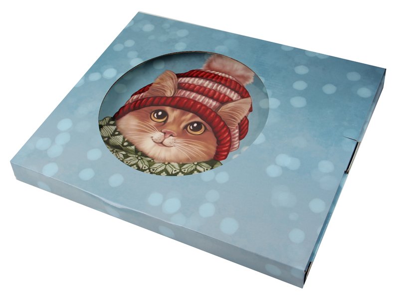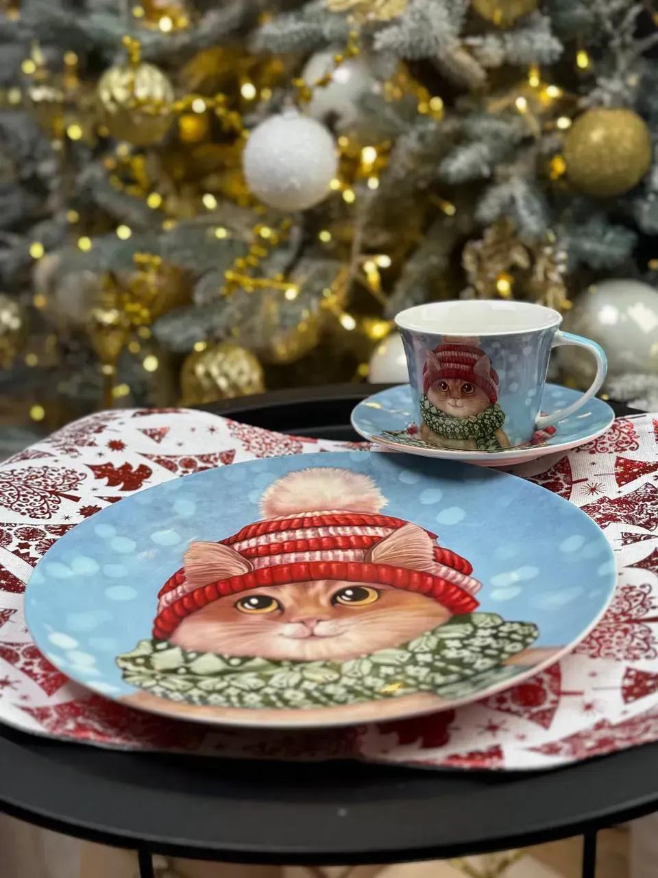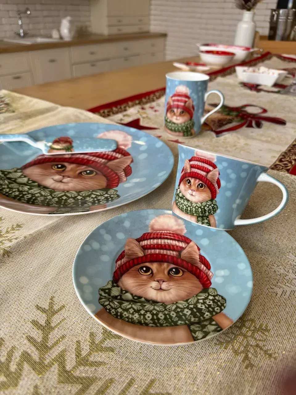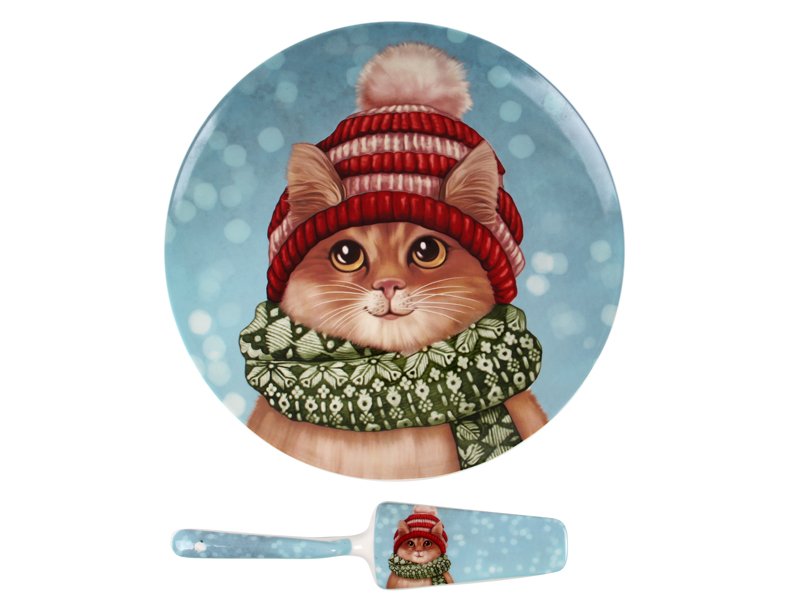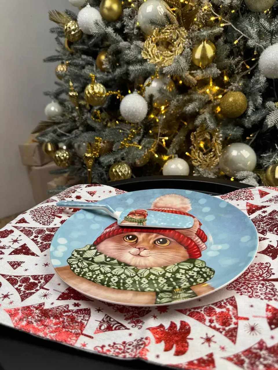 Фарфоровое блюдо для торта с лопаткой Christmas 27 см – это яркий и праздничный акцент для вашего стола. На белоснежной поверхности изображён милый кот в красной шапке с помпоном и зелёном вязаном шарфе, который сразу вызывает улыбку и создаёт атмосферу зимнего уюта. Такое оформление идеально вписывается в атмосферу Рождества и Нового года, делая сервировку по-настоящему особенной.