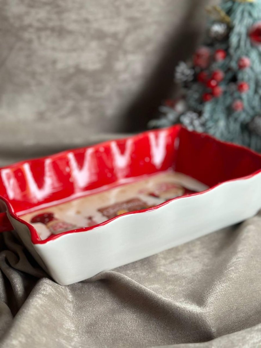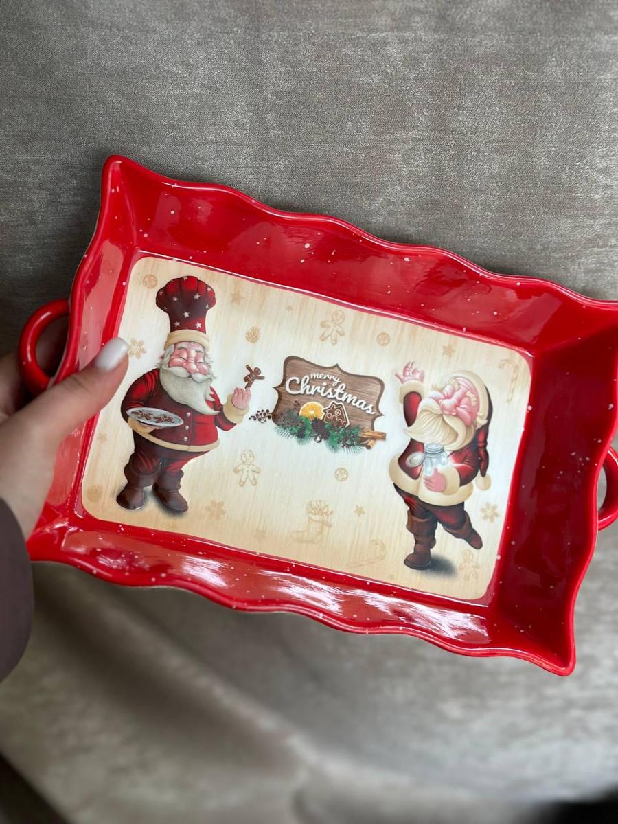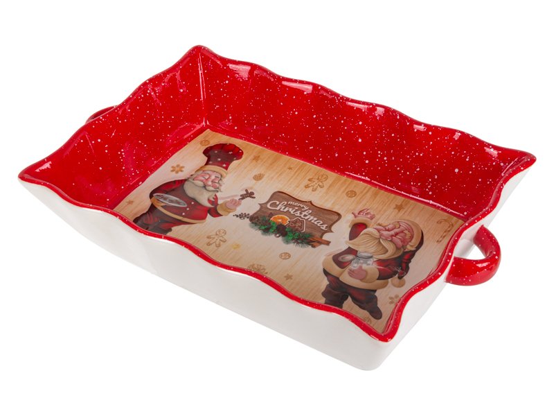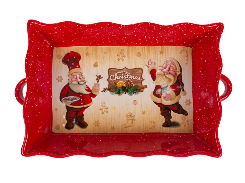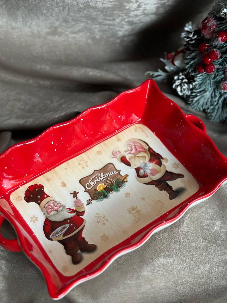 Блюдо для запекания «Санта» 30×18×6 см — это настоящее украшение вашей кухни и праздничного стола. Яркий красный цвет с эффектом снежных крапинок моментально привлекает внимание и создает атмосферу зимней сказки. На дне блюда изображены два забавных Санты — один с подносом угощений, другой в танце, а между ними красуется надпись «Merry Christmas» с имбирными пряниками. Каждая деталь рисунка пропитана духом праздника и теплом домашнего уюта.