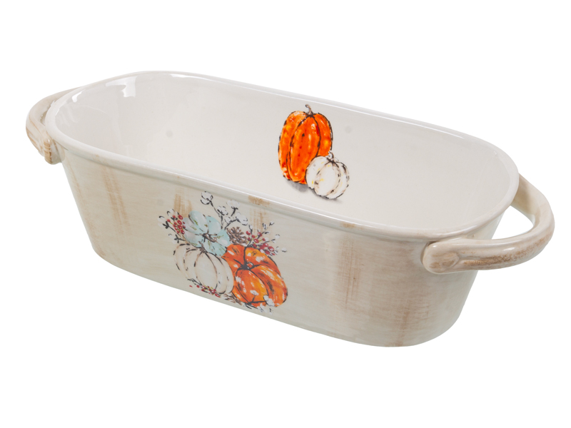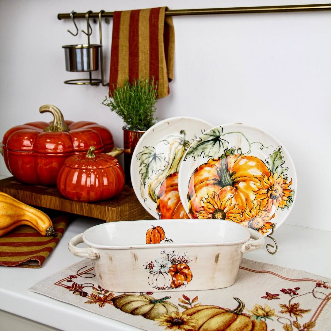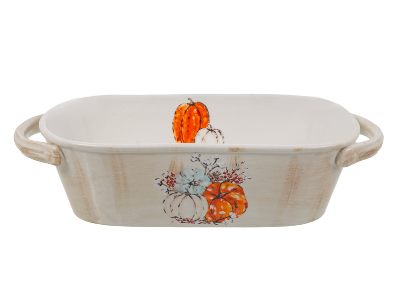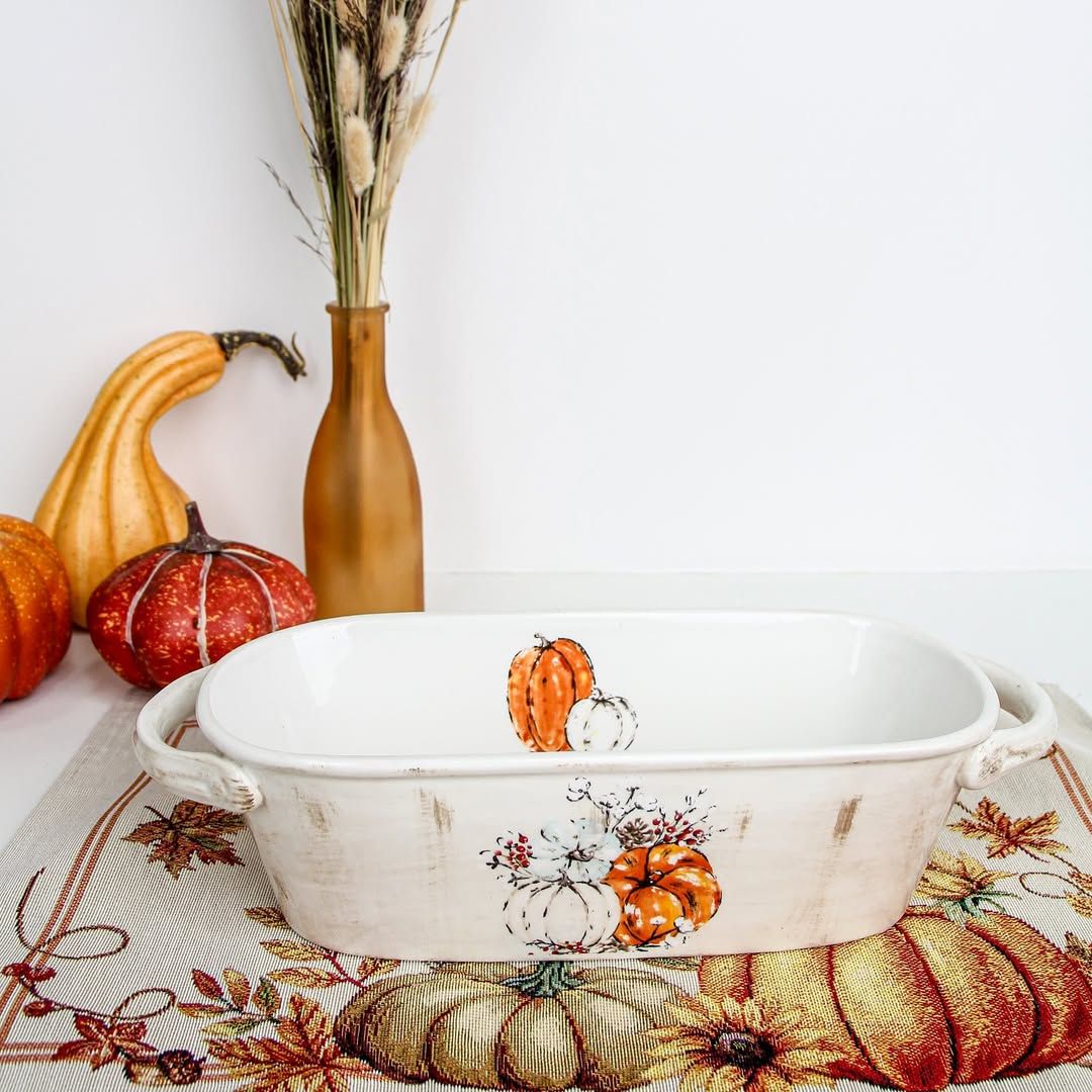 Блюдо для запікання «Гарбуз» 31,5×14×7,8 см – справжня знахідка для тих, хто любить готувати з душею. Яскравий малюнок з помаранчевими та білими гарбузами на ніжному фоні створює атмосферу затишку та тепла на кухні, а містка форма дозволяє запікати м’ясо, овочі, пасту чи навіть десерти. Кераміка рівномірно розподіляє тепло, завдяки чому страви виходять соковитими та ароматними.
