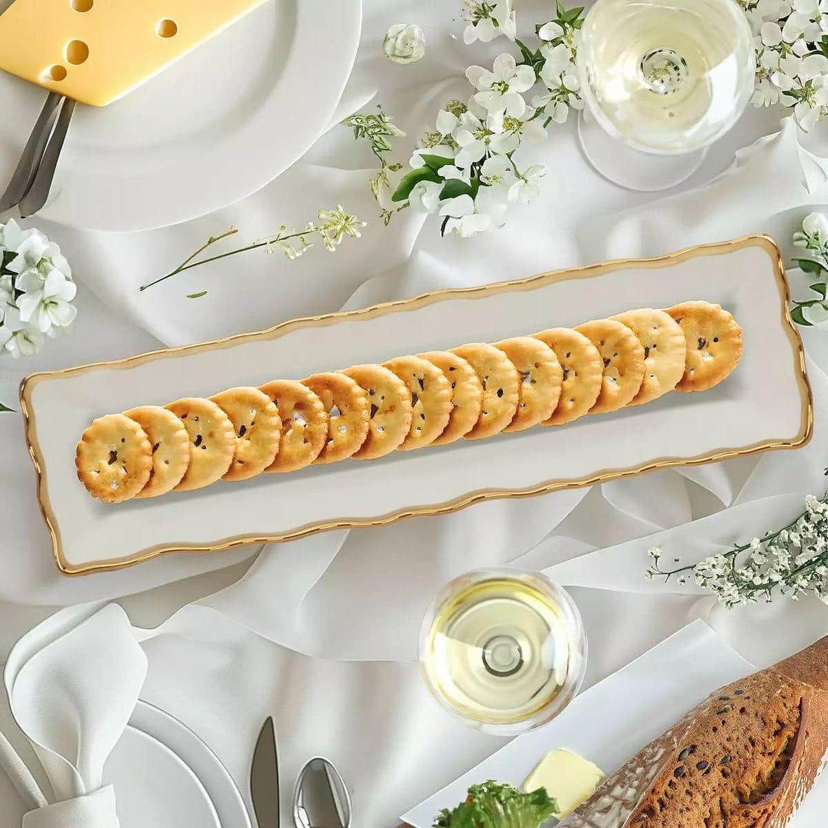 Довге глибоке блюдо Regency Gold — це стильний акцент для сервірування, який одразу привертає увагу. Білосніжна кераміка з хвилястим краєм і золотим кантом робить подачу вишуканою навіть у звичайний день. Ідеально підходить для закусок, рулетів, канапе, фруктів або елегантної подачі десертів. Подовжена форма економить місце на столі та дозволяє красиво розмістити інші страви. Міцна глазур захищає поверхню від подряпин і зберігає яскравість золотої лінії. Це блюдо стане улюбленою деталлю сервірування та підкреслить смак господині — в усіх значеннях.