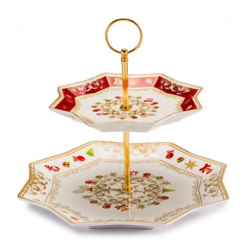 Блюдо етажерка "Новорічні іграшки" 24 см кістяна порцеляна для десертів 2 яруси призначена для подачі різного роду десертів, тістечок, цукерок та фруктів на святковий стіл. Виготовлена з високоякісної кістяної порцеляни італійською компанією Lamart. Входить до складу колекції Різдвяного посуду.