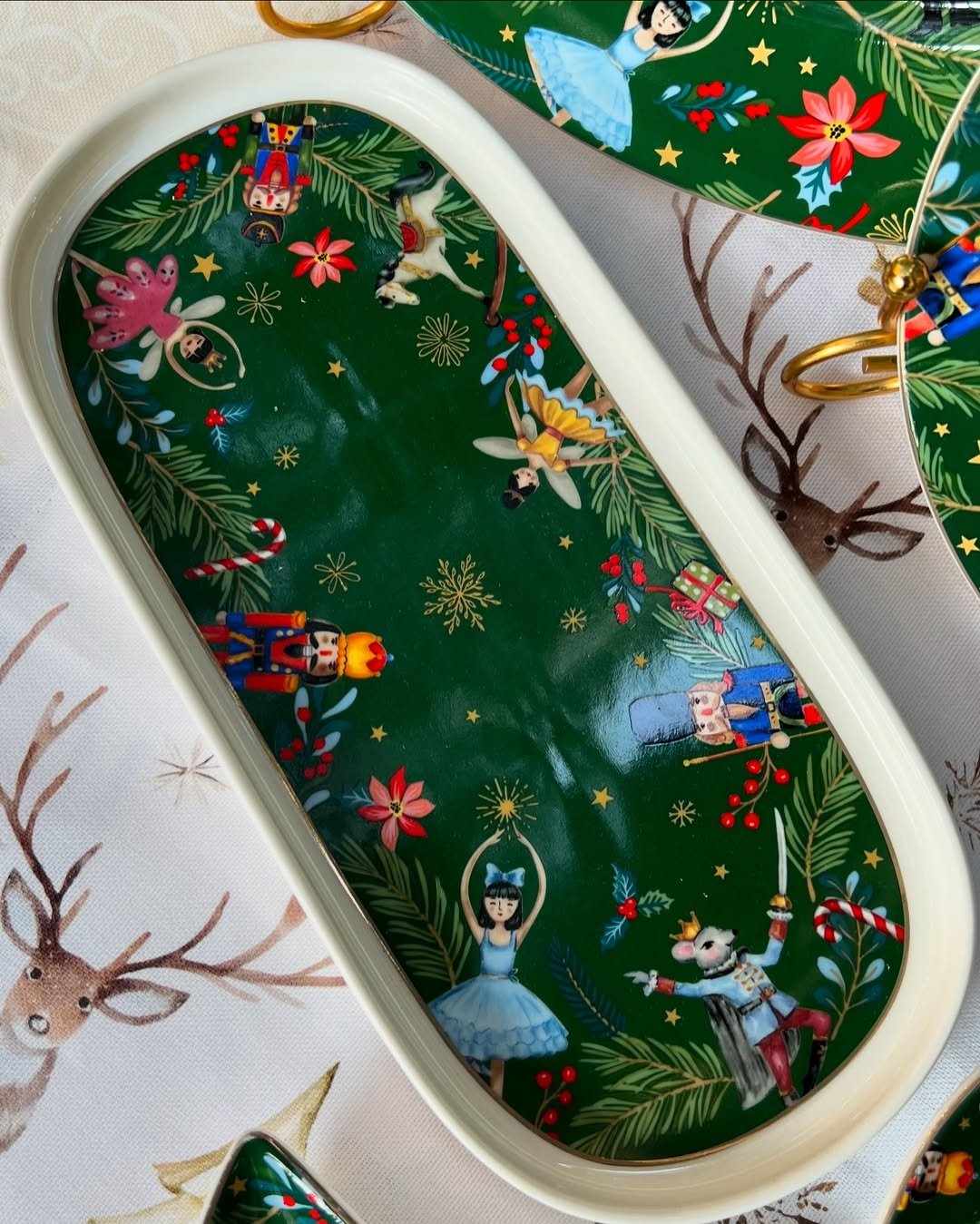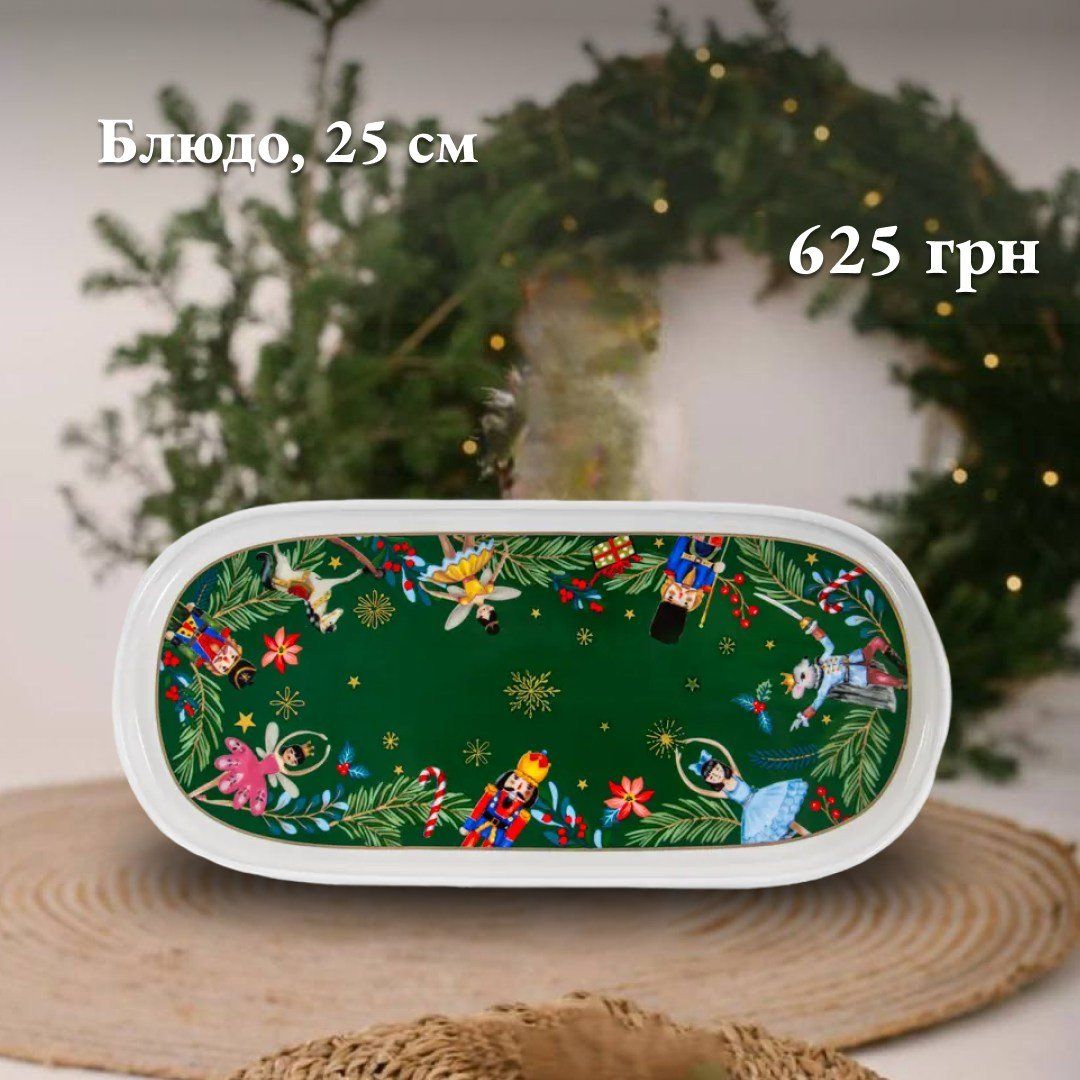Блюдо Green Christmas 25 см — это яркий акцент для вашего праздничного стола. Продолговатая форма и глубокий зеленый фон с тематическим рисунком создают атмосферу уюта и подчеркивают красоту рождественской сервировки. На поверхности изображены еловые ветви, игрушки, орехокол и балетные персонажи, которые делают дизайн по-настоящему выразительным.