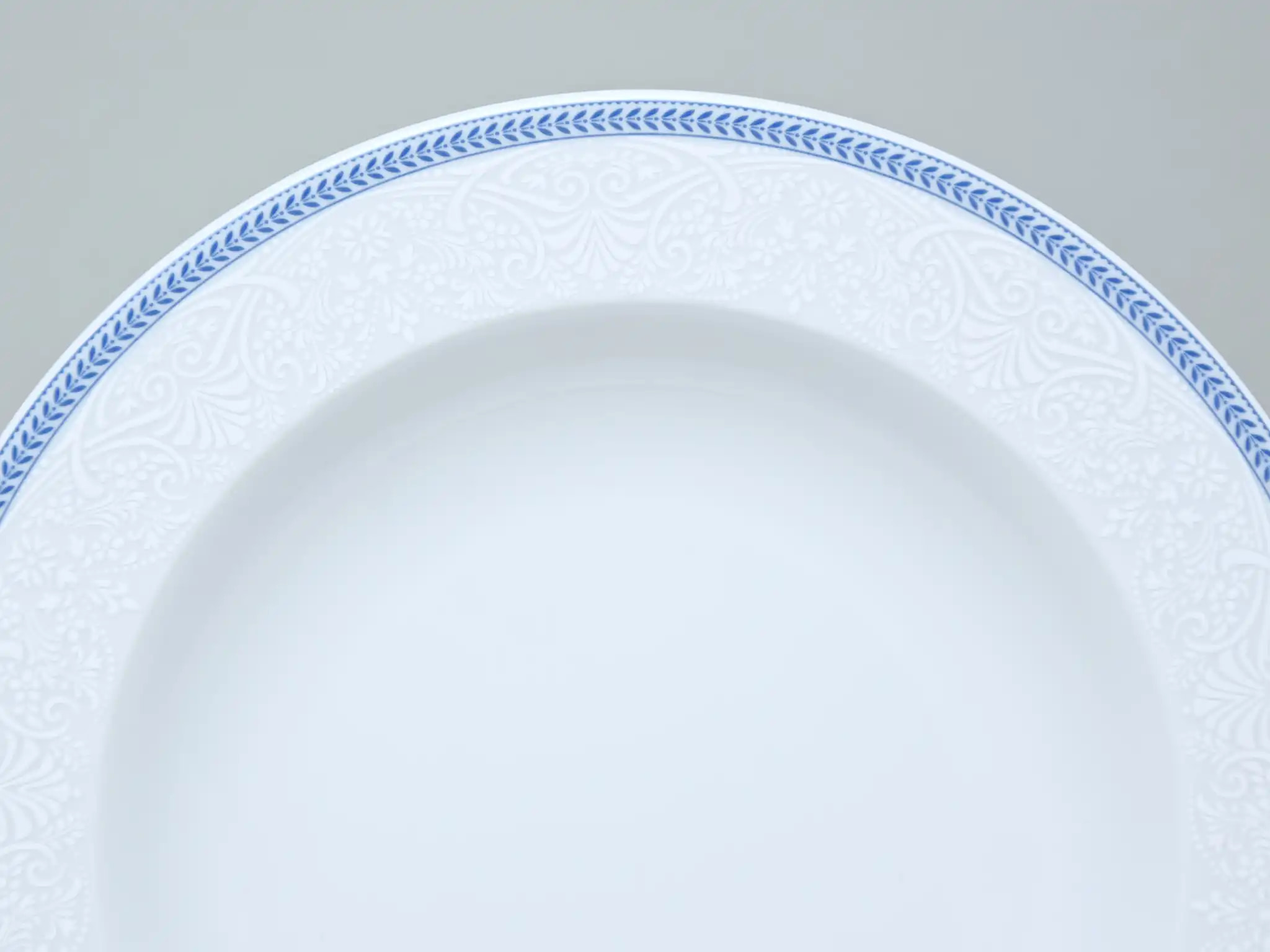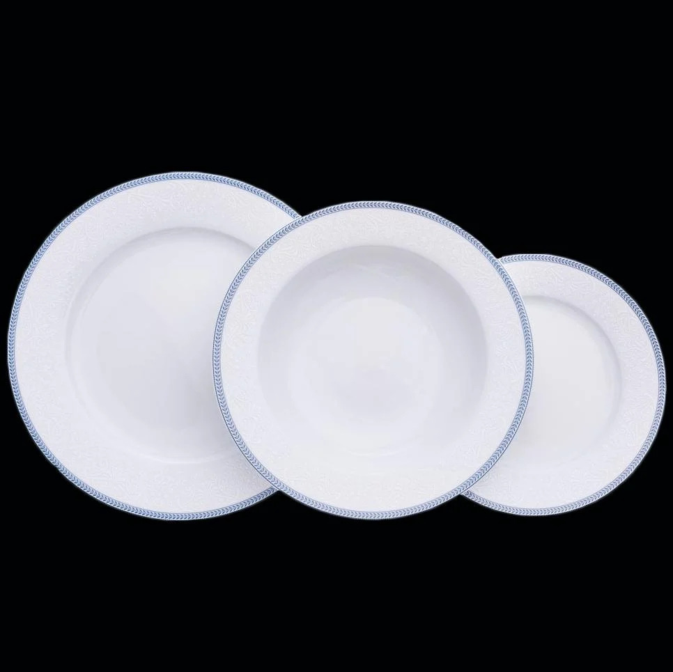 Ці блюда — як ніжна мелодія на вінілі, яку ви вмикаєте за сімейним столом. Біла порцеляна, прикрашена вишуканим візерунком і синьою окантовкою, створює відчуття теплих обідів, бабусиних історій і душевної тиші.