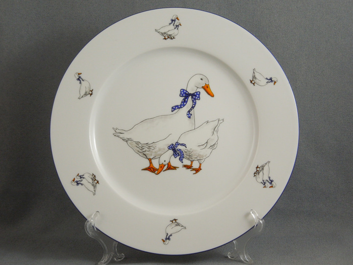 Блюдо фарфоровое круглое мелкое белое с рисунком Thun Saphyr Гуси 30 см с синей окантовкой
