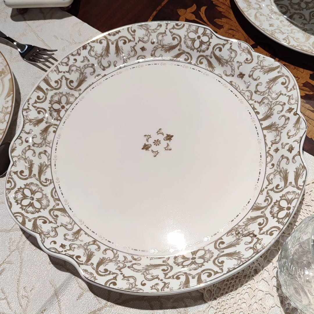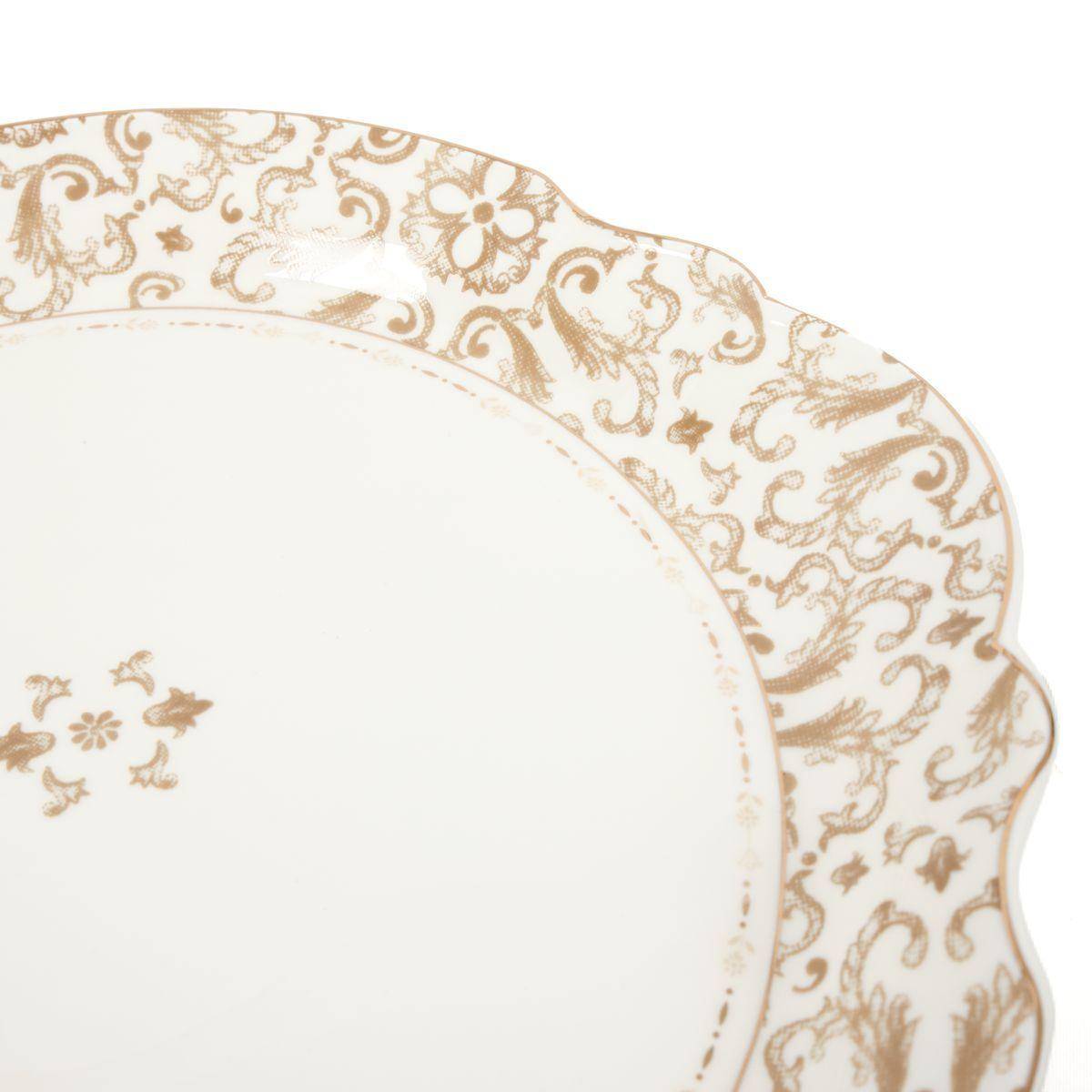 Эта современная, но изысканная форма посуды выглядит словно коллекционный экспонат старинного музея фарфора. Глубокое блюдо с плавными линиями декора украшено золотистыми узорами и элементами геральдики, вдохновлёнными классическими английскими мотивами.