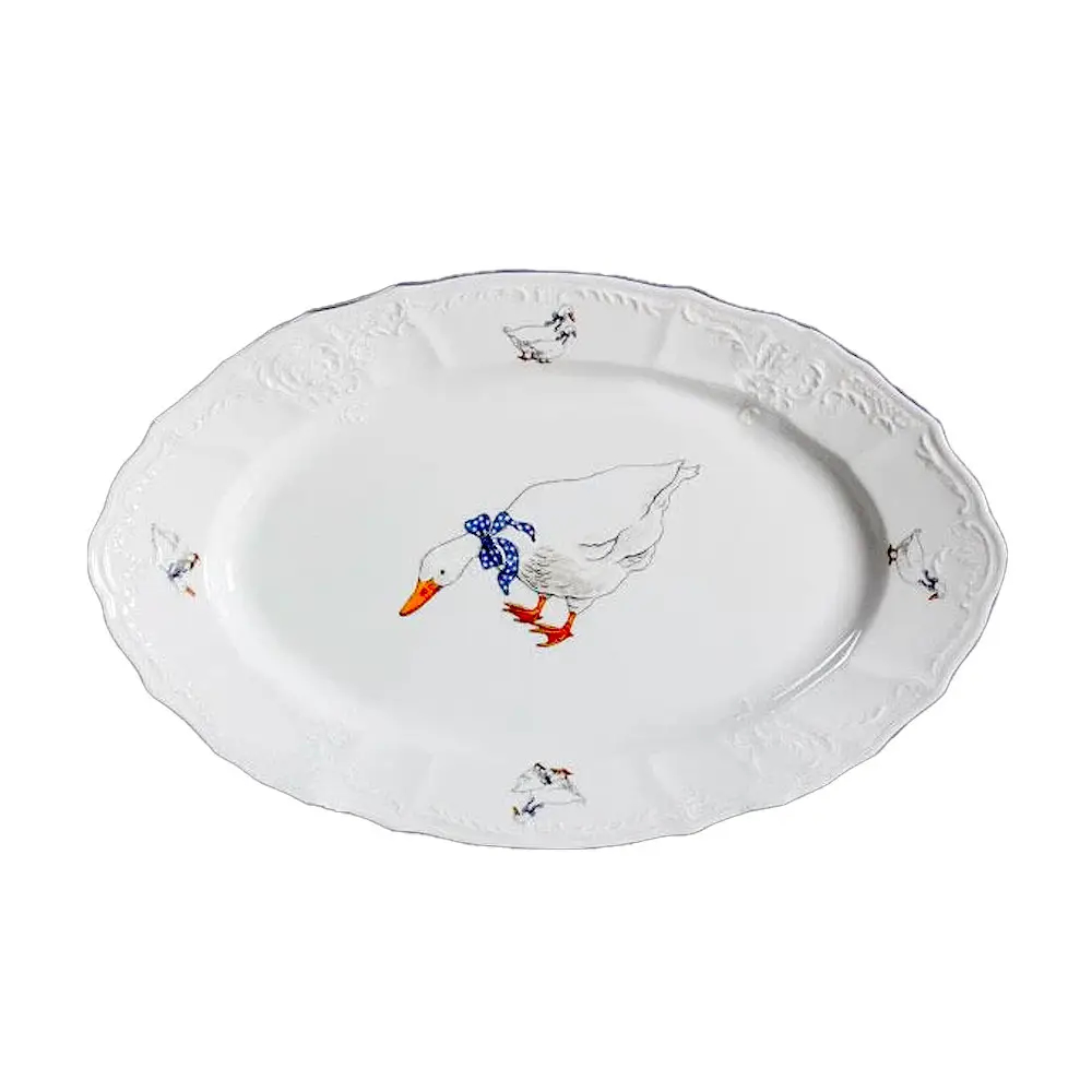 Блюдо фарфоровое овальное белое Bernadotte Гуси с темным ободком 34 см