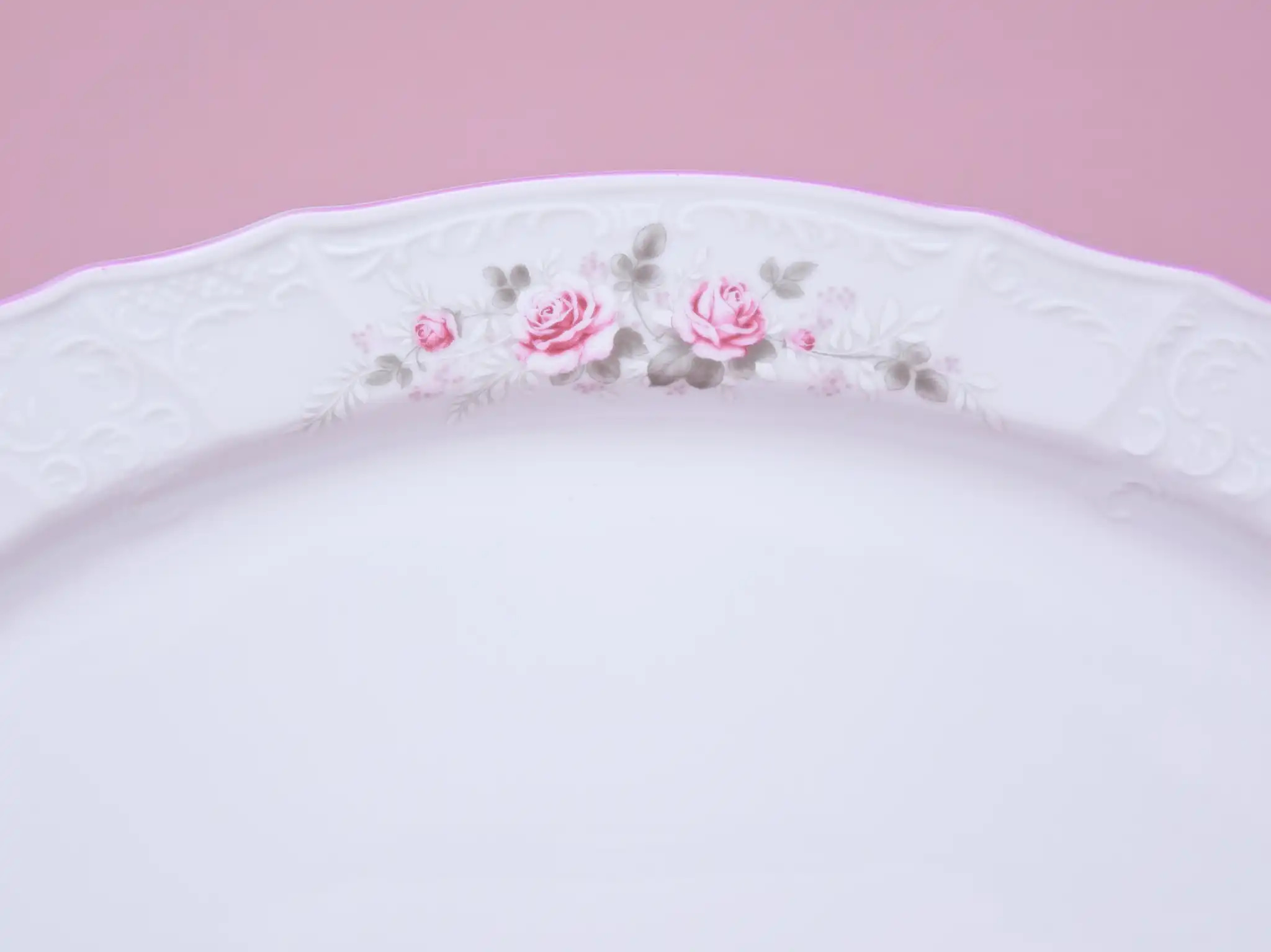 Тонкая отделка в розовых тонах и изящные лепестки роз — воплощение вкуса и утончённости. Приятный кант подчёркивает элегантные линии изделия и вносит в сервировку нотку романтики и уюта. Это идеальное блюдо для подачи как закусок, так и изысканных основных блюд на торжественный стол.