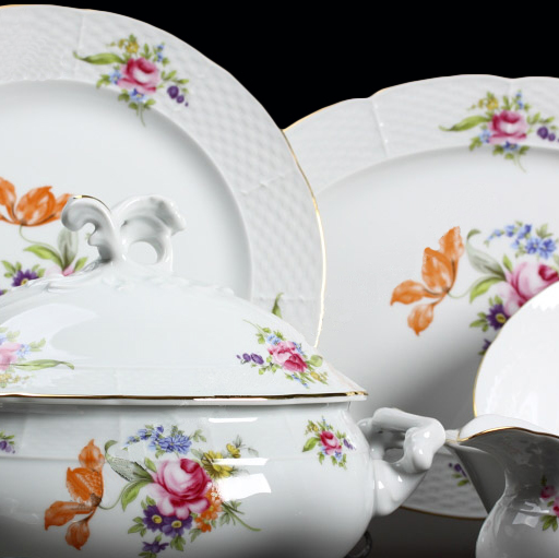 Овальные блюда Thun Menuet — как фарфоровые полотна, на которых ваша кулинария превращается в искусство. Их изысканный декор в духе «Мейсенского букета» напоминает старинные ботанические иллюстрации: бархатные розы, нежные лилии и полевые цветы словно только что собраны в саду под утренним солнцем. Каждое блюдо — это не просто подача, а живая история вкуса и красоты.