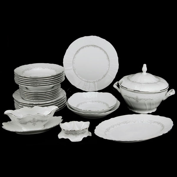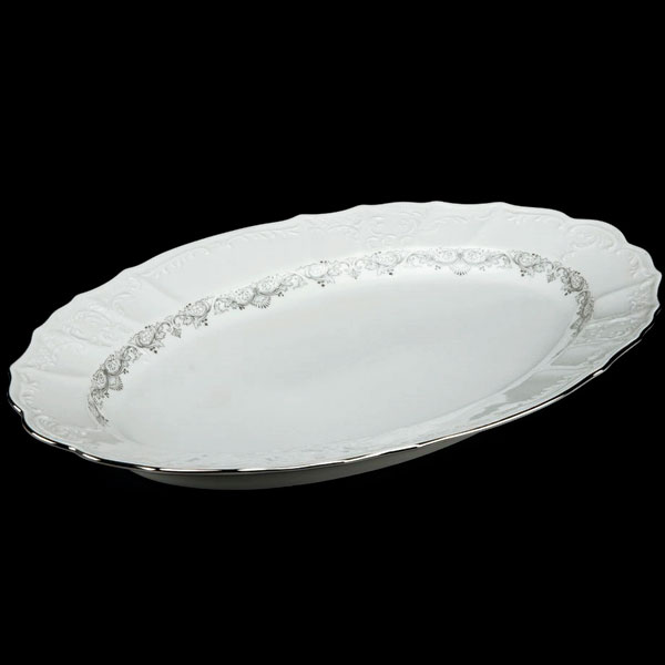 Коллекция Thun Bernadotte «Серебряное кружево» — это торжество утончённости и чешского фарфорового искусства. Овальные блюда из этой серии — не просто предмет сервировки, а главные герои праздничного стола. Изысканный узор, похожий на старинное серебряное кружево, окутывает белоснежную поверхность мягким сиянием, а платиновая кайма придаёт каждому блюду завершённость, подобно элегантной застёжке на вечернем наряде.