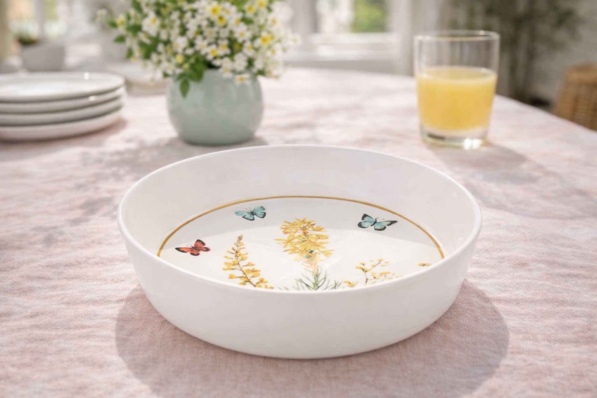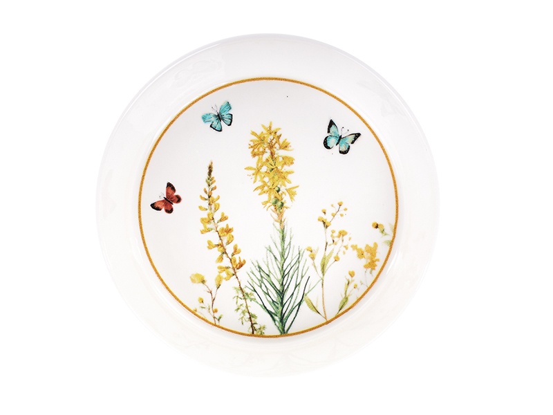 Блюда колекції Meadow — це ніжний подих природи у кожній деталі сервірування. Витончений малюнок польових квітів і легкі метелики ніби оживають на білосніжній кераміці, створюючи атмосферу затишку, тепла та гармонії прямо за столом. Тонка золота облямівка додає вишуканості й перетворює кожне блюдо на стильний акцент у вашому інтер’єрі.