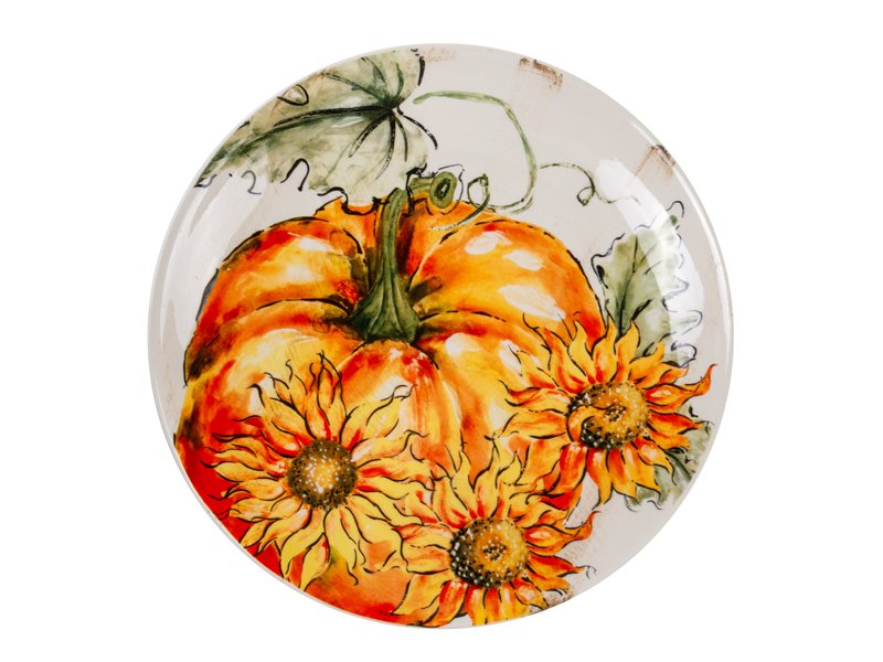 Блюдо «Осень» 24×24×2,5 см — это маленькое произведение искусства, которое перенесёт вас в атмосферу золотого сентября. Сочные оранжевые тыквы, солнечные подсолнухи и нежные травы на белоснежном фоне создают настоящий осенний натюрморт прямо на вашем столе. Такое блюдо моментально привлекает внимание гостей и превращает любую подачу в эффектную сервировку.
