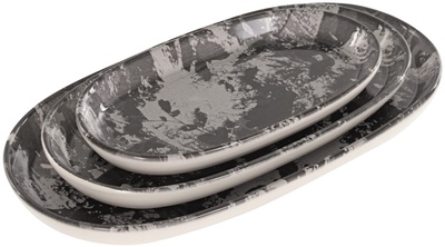 Блюда выполнены в вытянутой форме и представлены в трёх размерах: для основных блюд, закусок и десертов. Их объединяет эффектный серо-графитовый рисунок с уникальным «пылевым» узором, словно созданным случайным касанием природы и архитектуры. Такое оформление придаёт сервировке глубину и динамику.