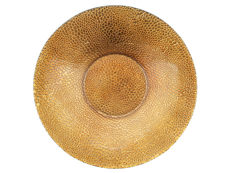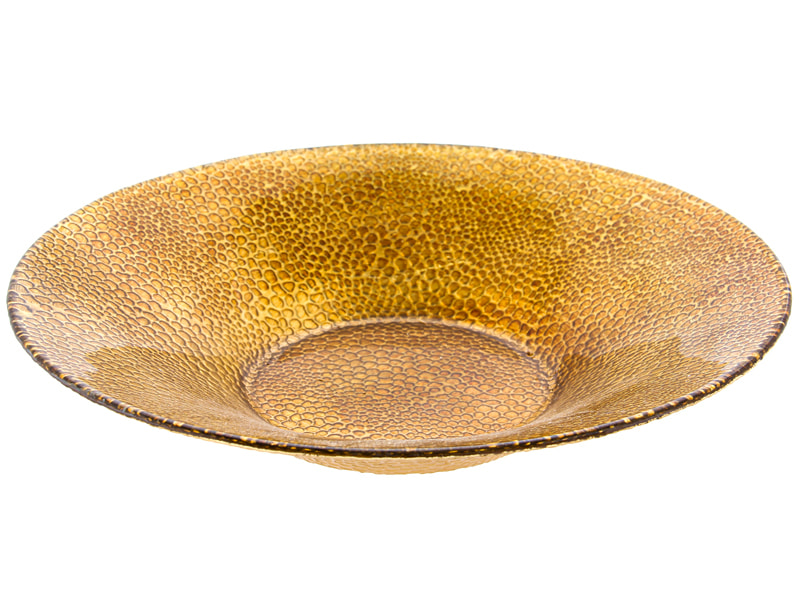 Кругле скляне блюдо «Змія» діаметром 27 см виконане в благородному золотому відтінку з фактурною поверхнею, що імітує зміїну шкіру. Поверхня декоративного візерунка створює ефект рельєфу та підкреслює глибину кольору, роблячи виріб візуально виразним і самобутнім.