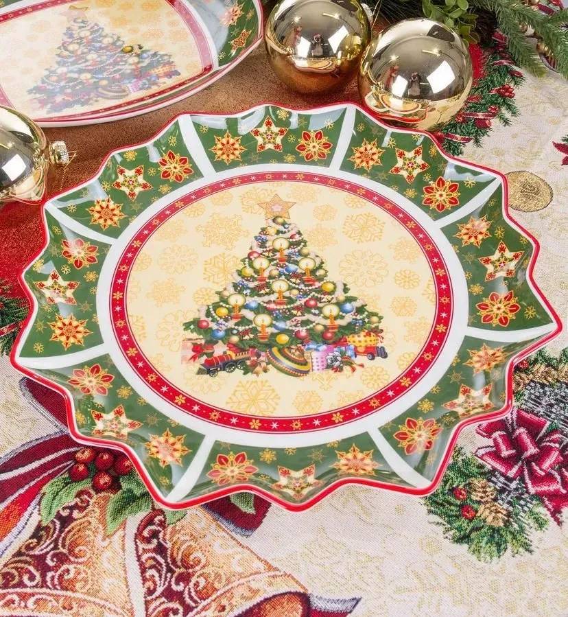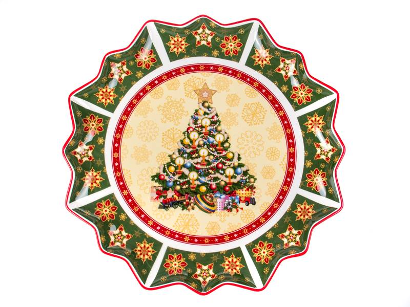 Фарфоровое блюдо New Year Collection диаметром 39 см — это эффектный акцент праздничной сервировки, который моментально создаёт атмосферу торжества и уюта. Роскошная форма с волнистыми краями и глубоким насыщенным зелёно-красным оформлением украшена золотыми снежинками и изящными звёздами, благодаря чему блюдо выглядит по-настоящему нарядно. В центре — нарядная новогодняя ёлка, у подножия которой собраны игрушки и подарки, напоминая о предвкушении праздника и семейных традициях.