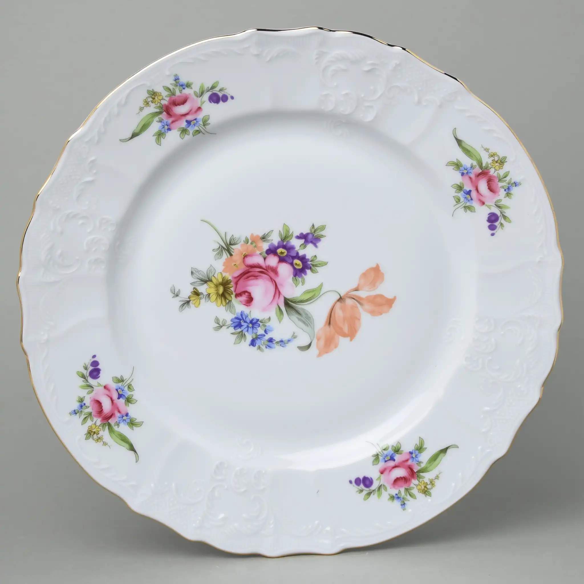 Блюдо круглое мелкое цветное Thun Bernadotte Мейсенский Букет с золотой оторочкой 32см