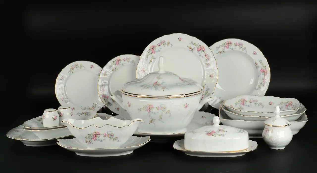 Фарфор гладкий, приятный на ощупь, а декор выполнен с точностью и аккуратностью. Позолоченная кайма добавляет завершённости, а нежный розовый рисунок не перегружает визуально, а лишь подчёркивает форму. Даже в повседневном использовании эти блюда остаются элегантными и выразительными, а в праздничной атмосфере — особенно уместны.