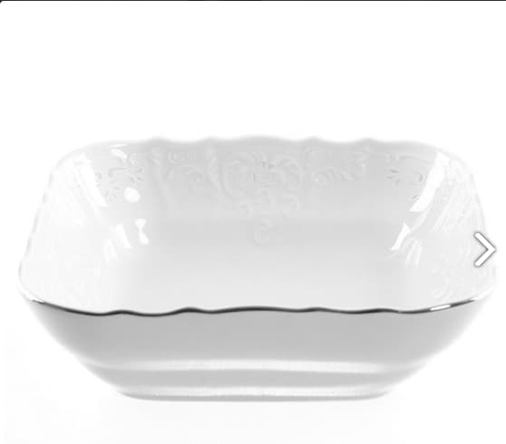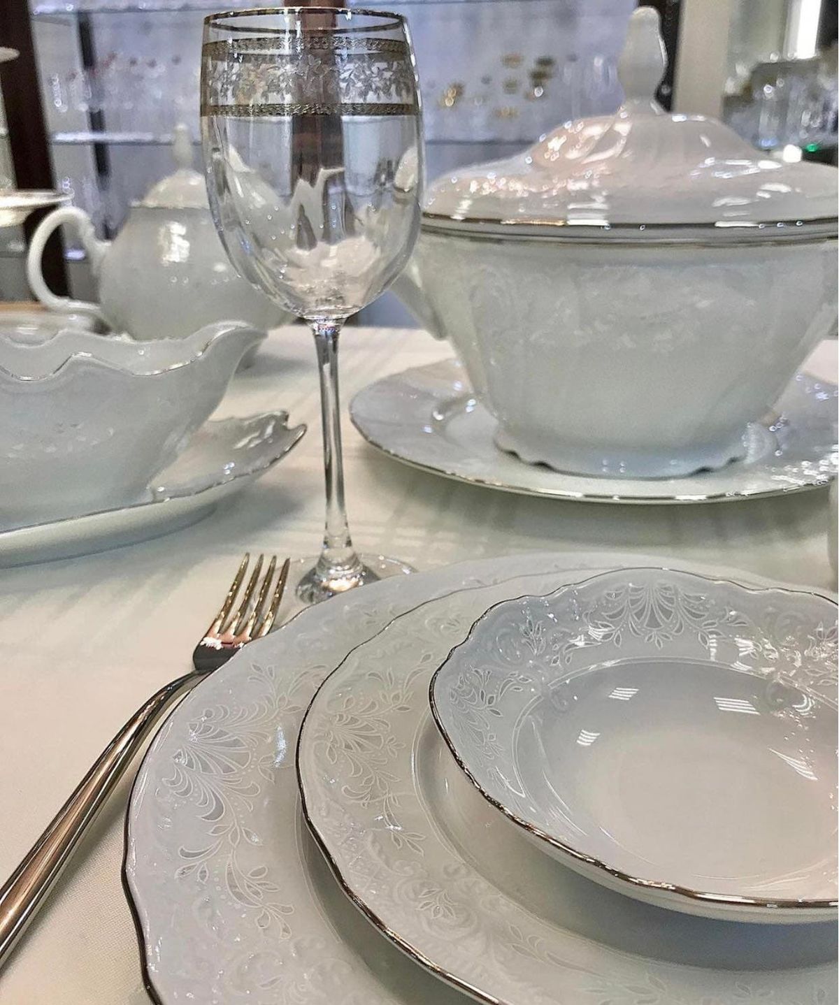 Матеріал: високоякісна порцеляна. Біла порцеляна з рельєфним мереживним малюнком, срібляста обробка. Колекція Наречена це гладкий посуд з нанесеним візерунком ніжно-сріблястого кольору.