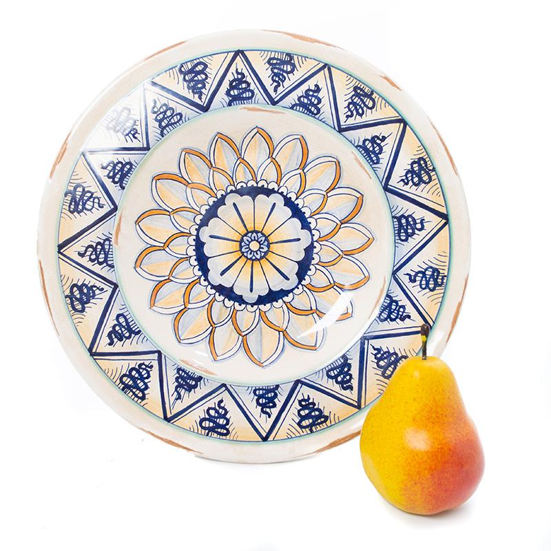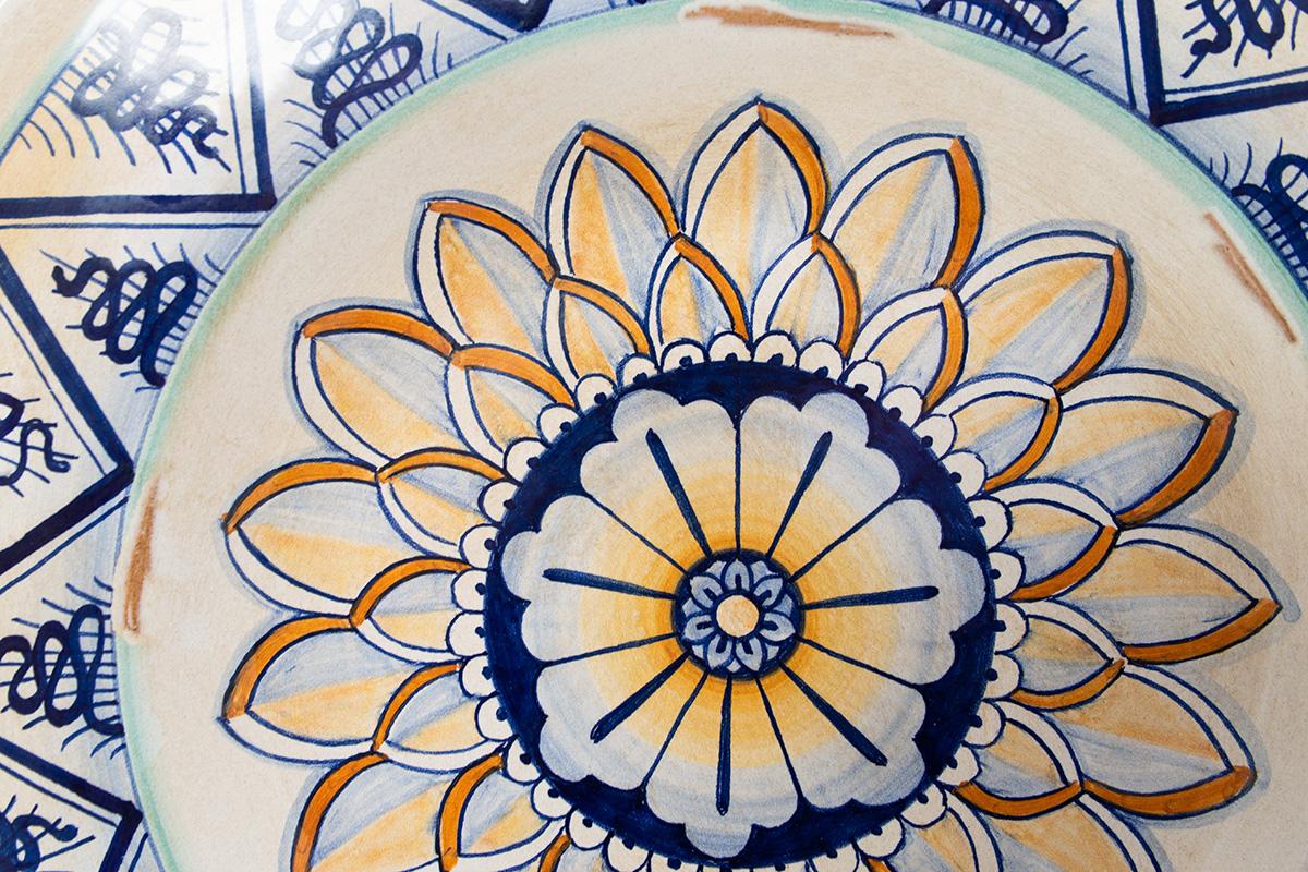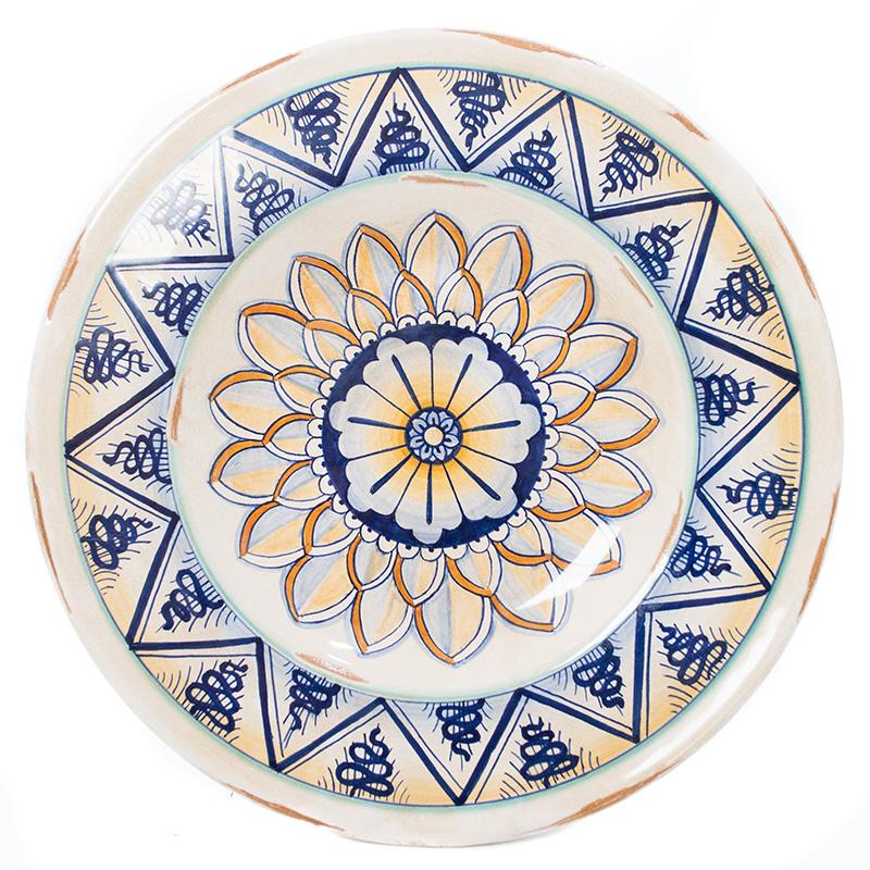 Виріб створений вручну на всіх етапах виробництва, тому ексклюзивні штрихи та відтінки присутні у кожній моделі. У витончені лінії блакитного орнаменту пензель художника додав теплих сонячних акцентів. Елементи штучно створеної потертості надають тарілці вигляду раритетного предмета.