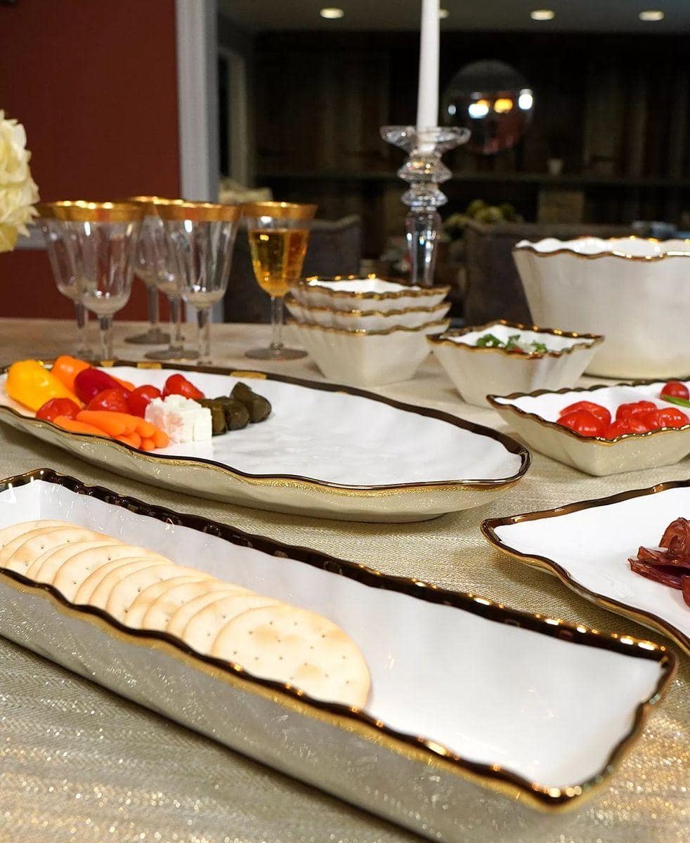 Це довге овальне блюдо Regency Gold створене для ефектної подачі, яка перетворює будь-який стіл на стильну композицію. Білосніжна поверхня з витонченою золотою хвилею по краю виглядає вишукано й підкреслює красу кожної страви. Його великий розмір 50×22 см ідеально підходить для риби, закусок, фруктів, канапе та святкових частувань. На такому блюді їжа виглядає ще апетитнішою, а сервірування набуває преміального вигляду. Міцна кераміка гарантує довговічність та дозволяє користуватися блюдом щодня. Це універсальний акцент сервірування, який створює враження без зайвих слів і спонукає обрати саме його.