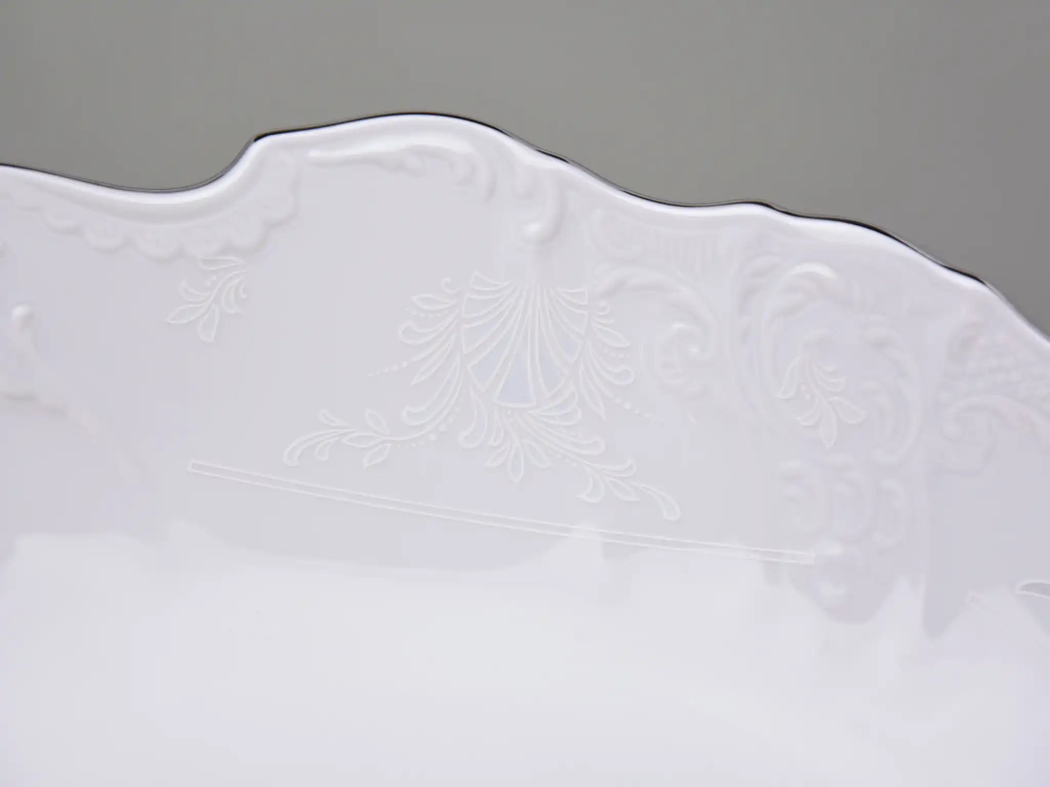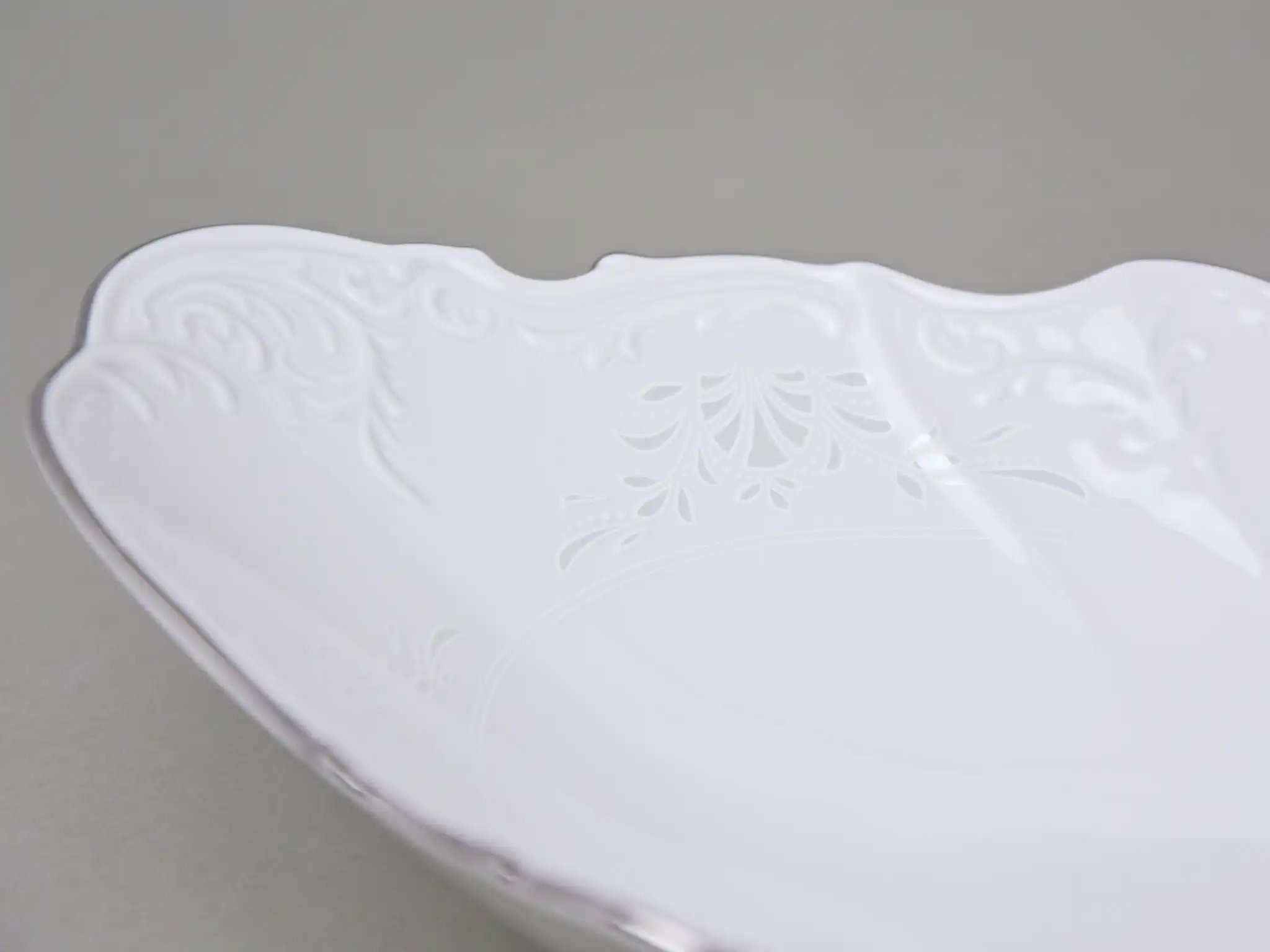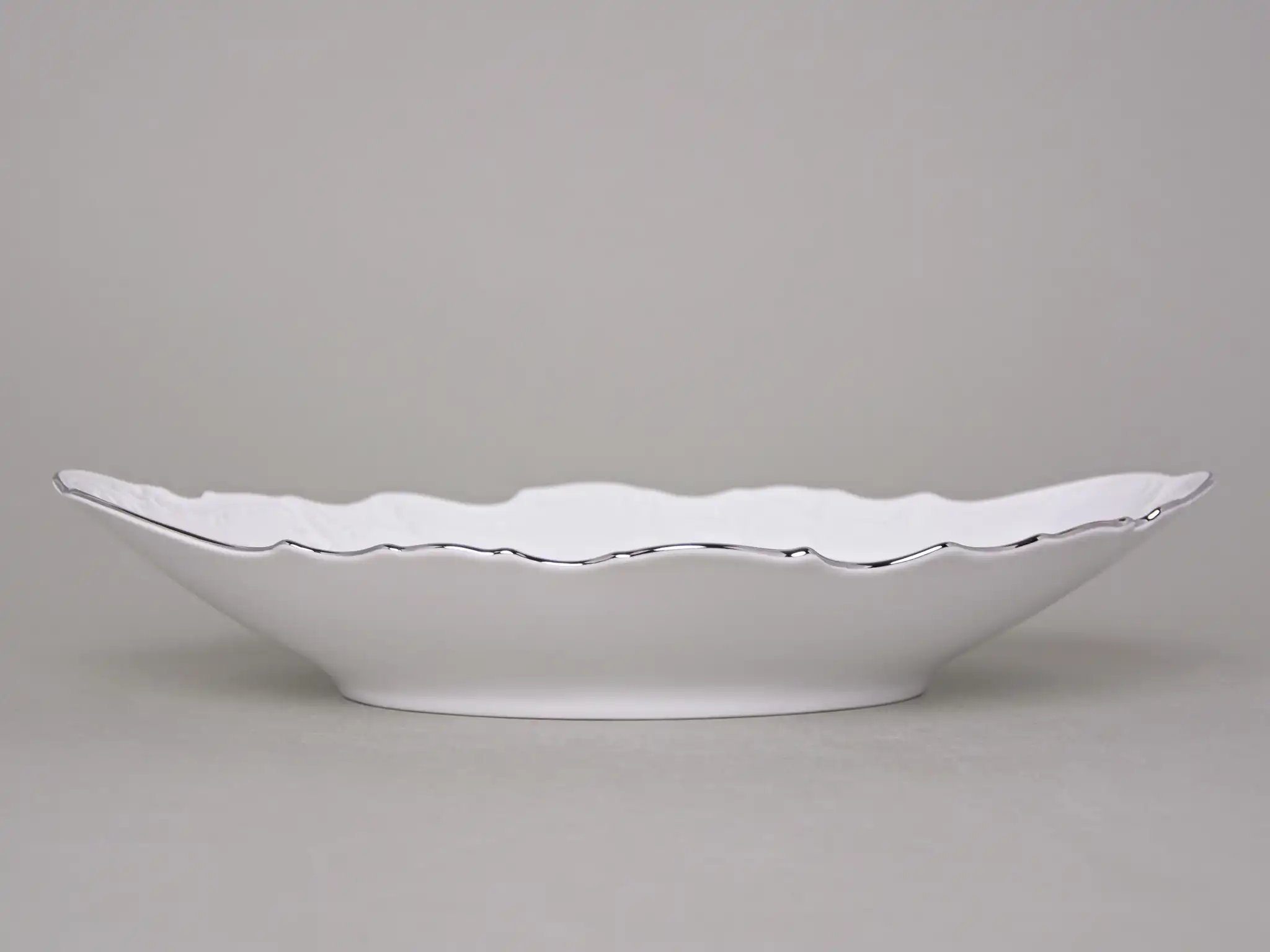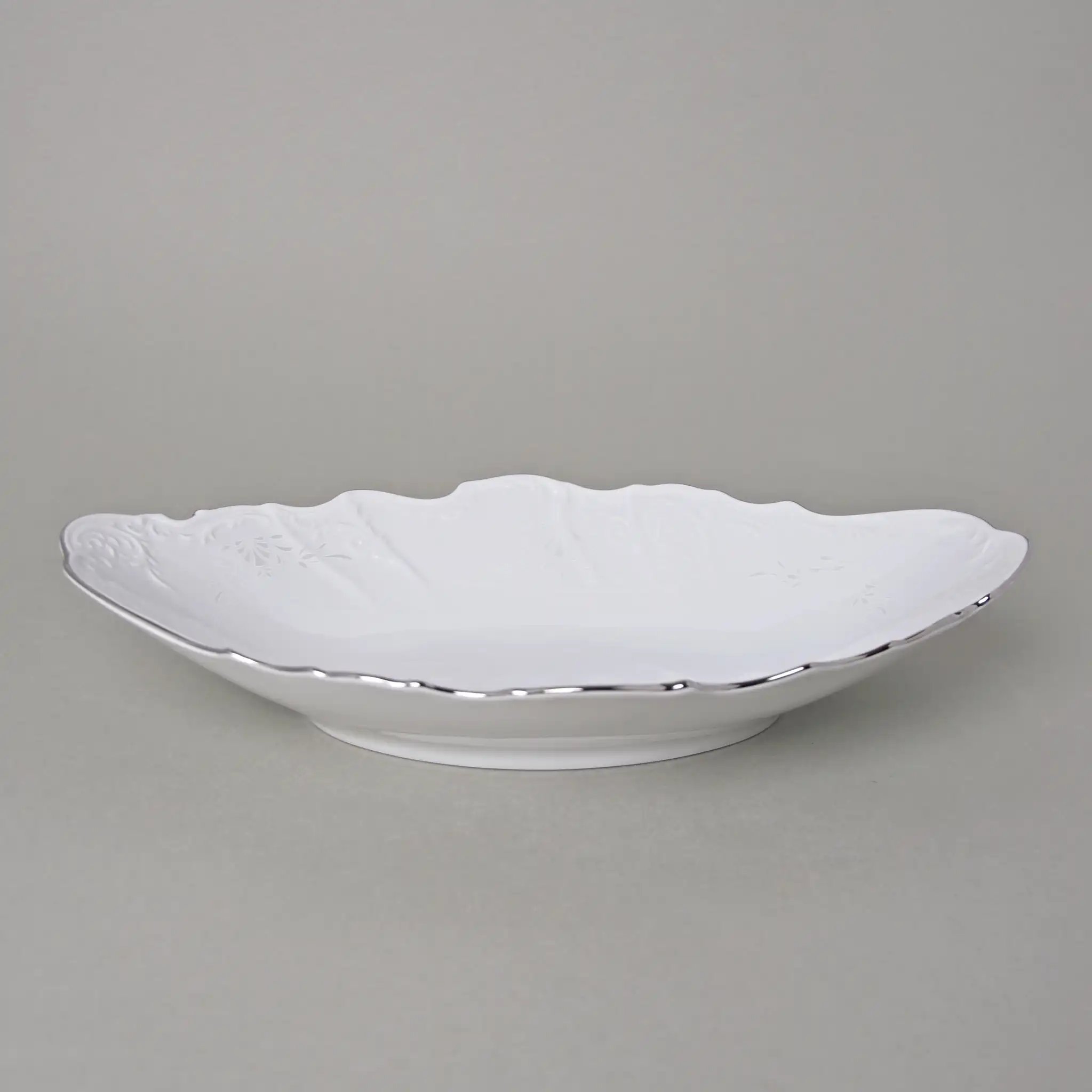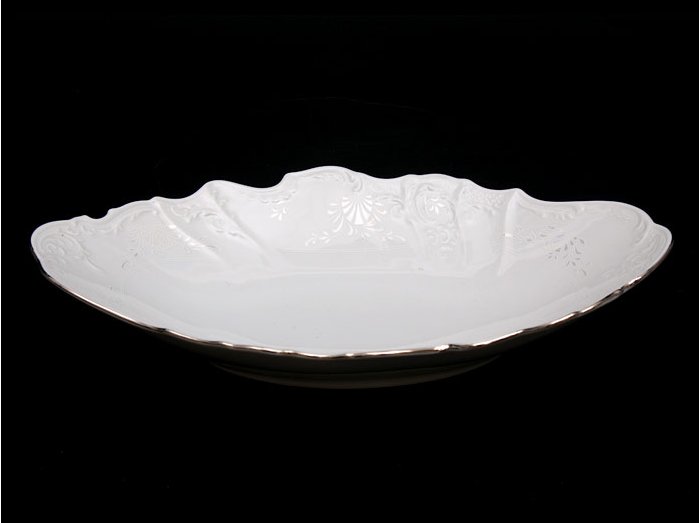 Перед вами не просто сервировочное блюдо — это воплощение благородства и изысканности, созданное мастерами знаменитой чешской мануфактуры Thun. Его овальная форма длиной 34 см словно нарисована плавными мазками кисти художника, а белоснежная фарфоровая поверхность украшена тонким рельефным узором, будто вышивкой по фарфору. Платиновая окантовка подчёркивает элегантность линий и придаёт предмету сияние достойное королевской трапезы.
