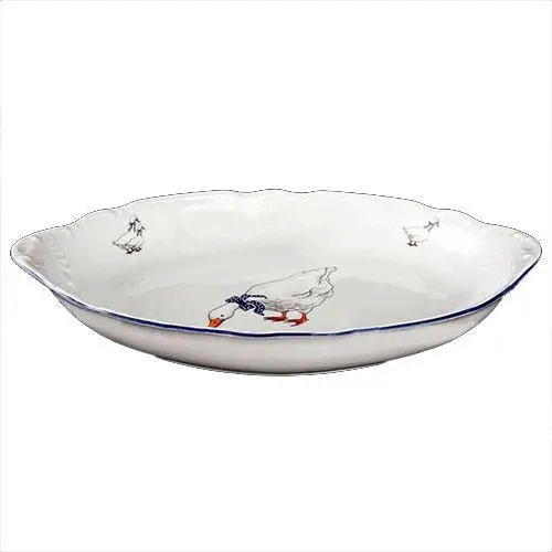 Блюдо овальное фарфоровое с рисунком Thun Opal Гуси 33 см с синей каёмочкой