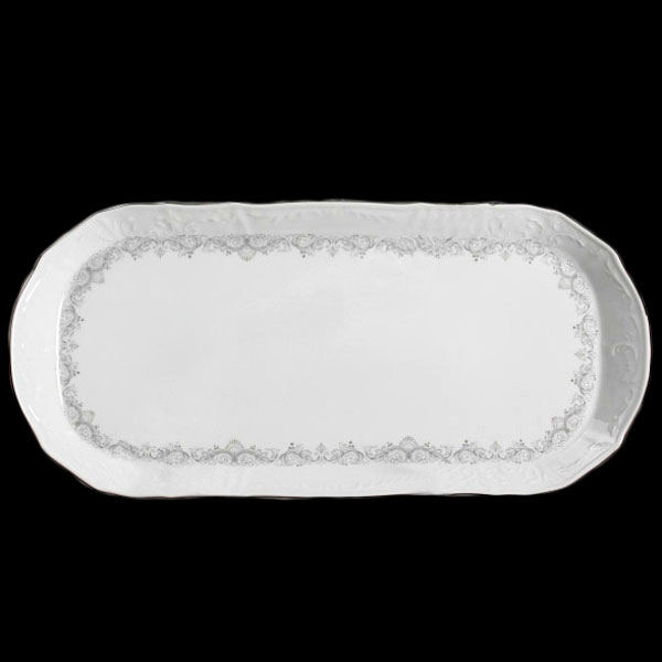 Блюдо-поднос фарфоровое прямоугольное белого цвета с декором Thun Bernadotte Серебряное Кружево 37 см с платиновым кантом