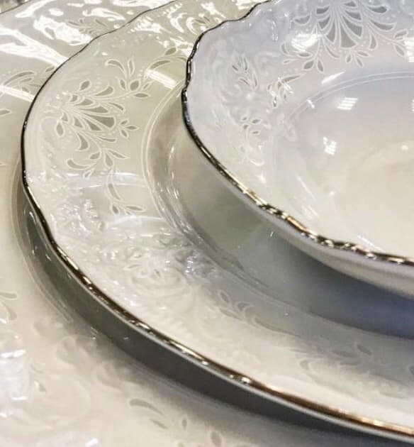 Матеріал: високоякісна порцеляна. Біла порцеляна з рельєфним мереживним малюнком, срібляста обробка. Колекція Наречена це гладкий посуд з нанесеним візерунком ніжно-сріблястого кольору.