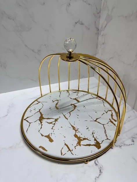 Конструкція блюда вирізняється особливою оригінальністю: металева основа виконана у вигляді витонченого купола з прозорою ручкою-кристалом. Таке оформлення перетворює виріб не лише на зручний предмет сервірування, а й на стильний декоративний акцент. Блюдо підійде для подачі фруктів, тістечок, канапе, сирів чи інших закусок, забезпечуючи гармонійне оформлення столу.