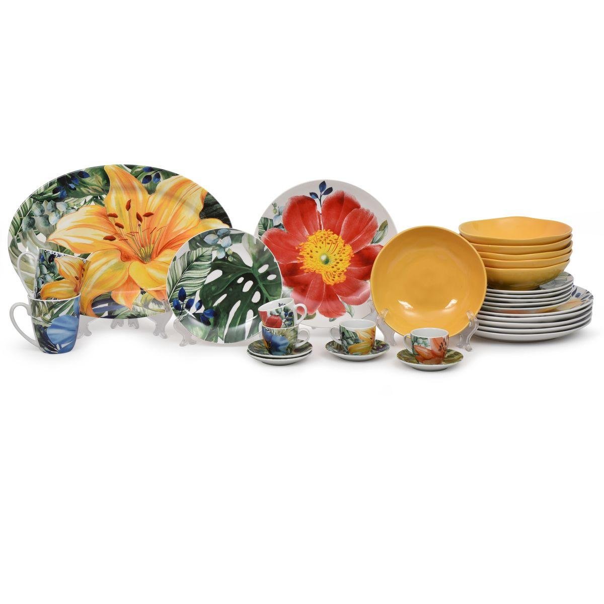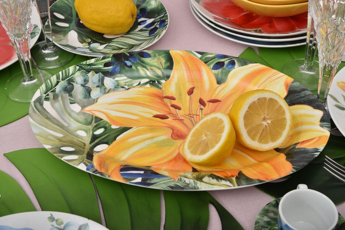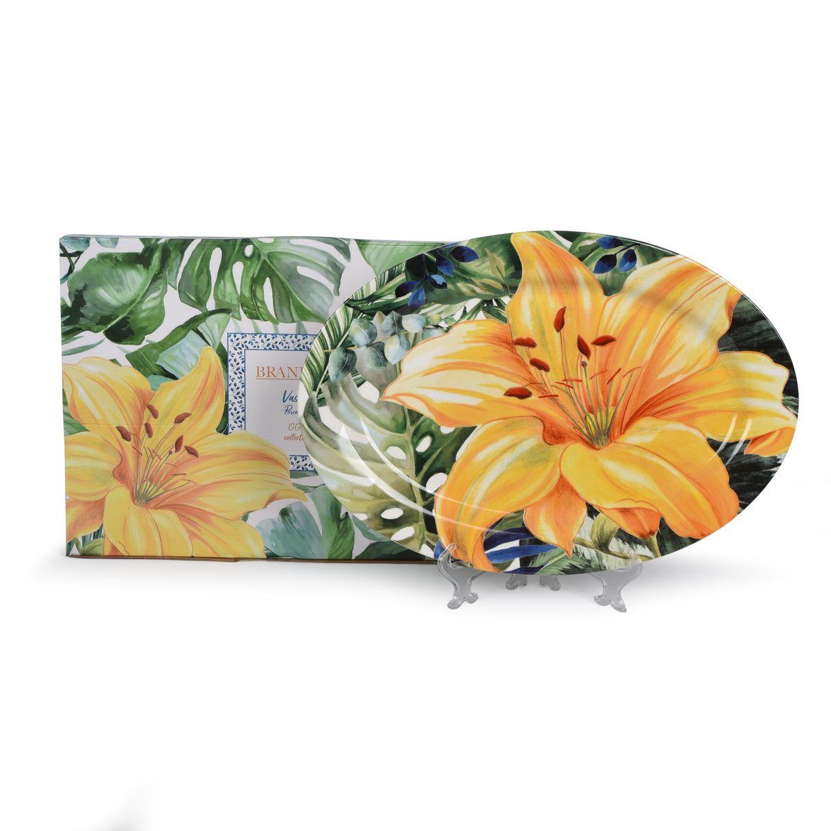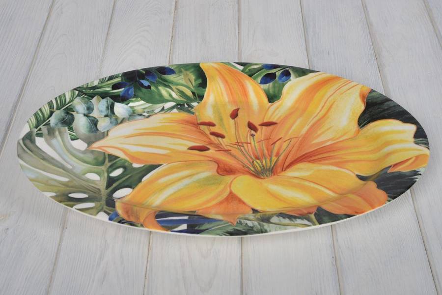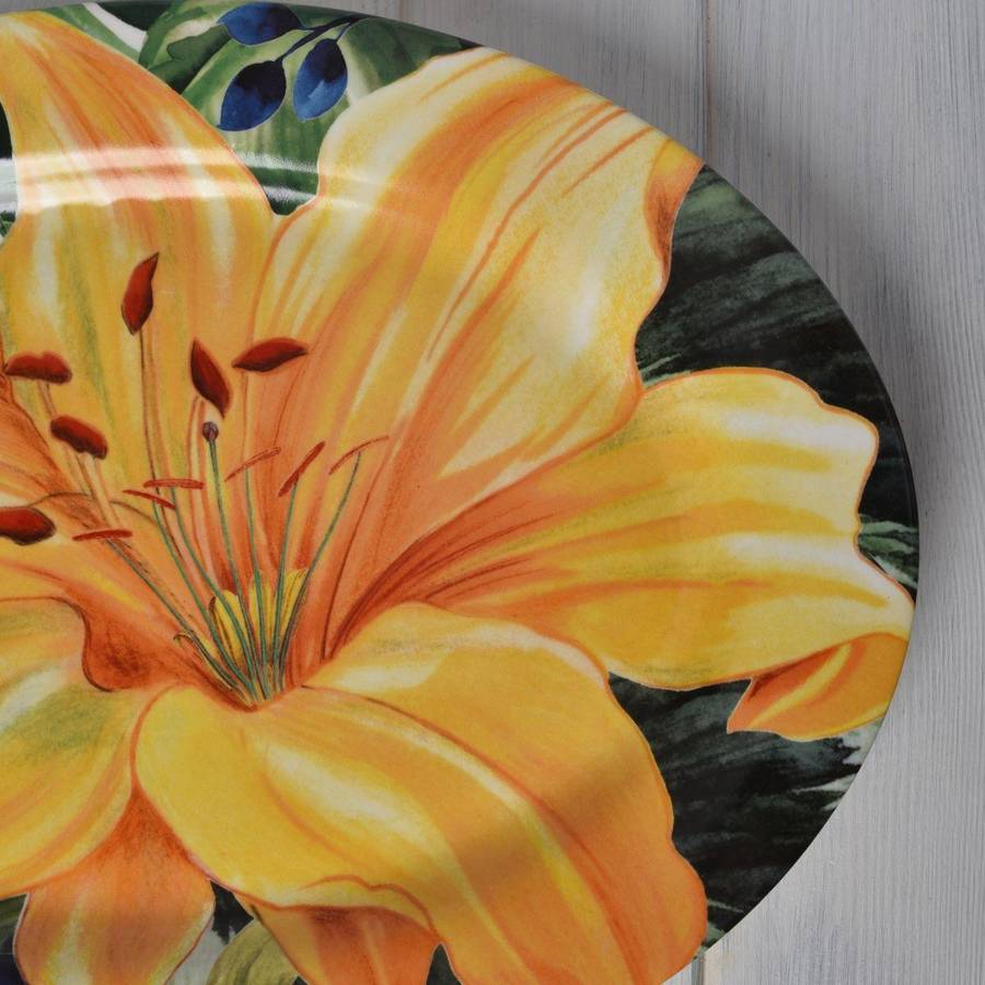 Фарфоровое блюдо с лилией из коллекции «Тропические цветы» от итальянского бренда Brandani — это настоящее произведение искусства. На фоне сочной зелени тропических листьев расцветает роскошная оранжевая лилия, символ солнца и жизненной энергии. Такое блюдо не просто посуда, а акцент, который оживит любой стол — от летнего завтрака до праздничного ужина.