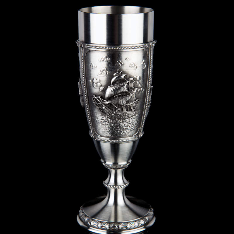Данный бокал для вина выгодно отличается от большинства продукции подобного типа. Художественная подача, эффект чернения и филигранная работа в совокупности создают полную иллюзию старинного фамильного серебра. Этот эксклюзивный прибор выглядит торжественно и на столе, и просто в интерьере. Олово издавна успешно применяется при изготовлении посуды, материал практичен, износостоек, а самое главное, — безопасен для здоровья. Германия-Австрия занимается производством посуды из стекла и олова с 1975 года. Продукция фирмы является эталоном высочайшего качества ручной работы.