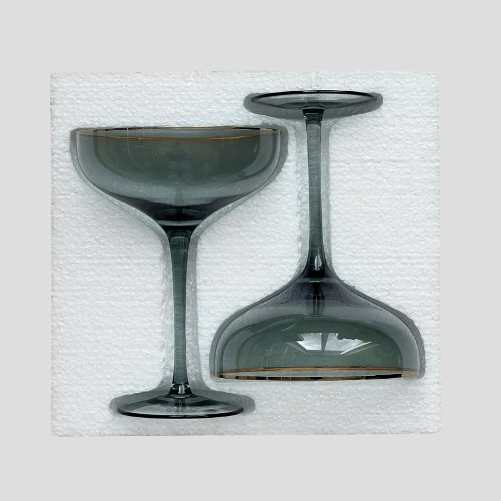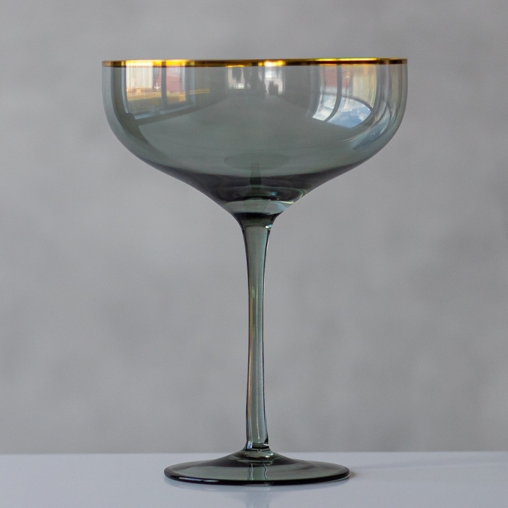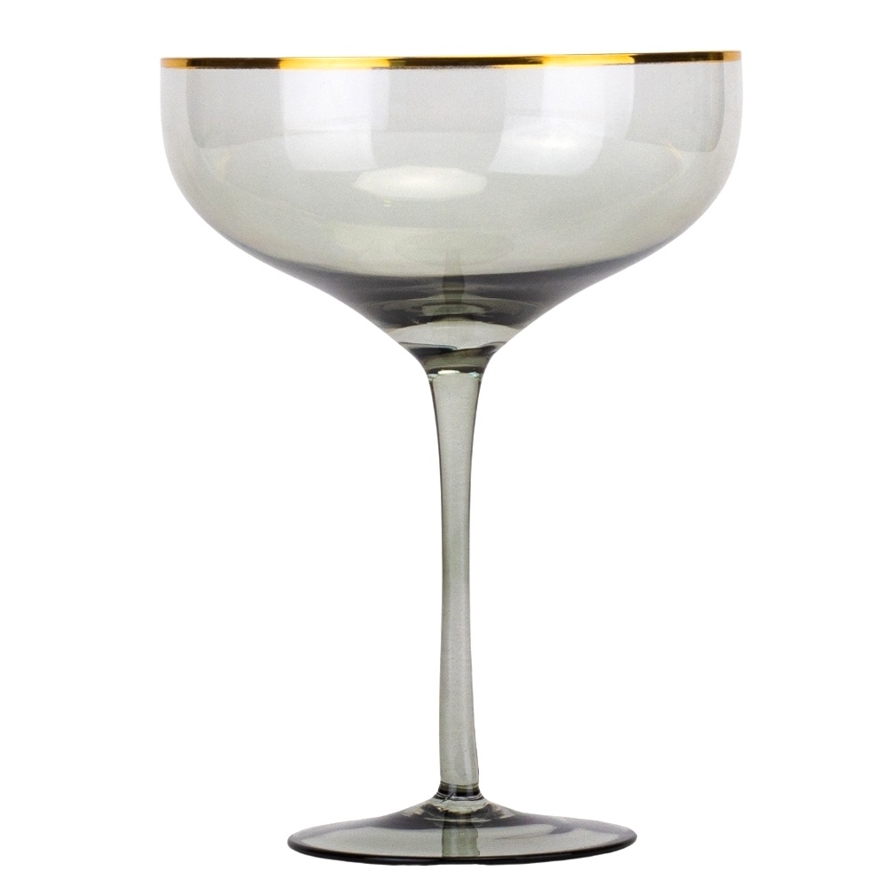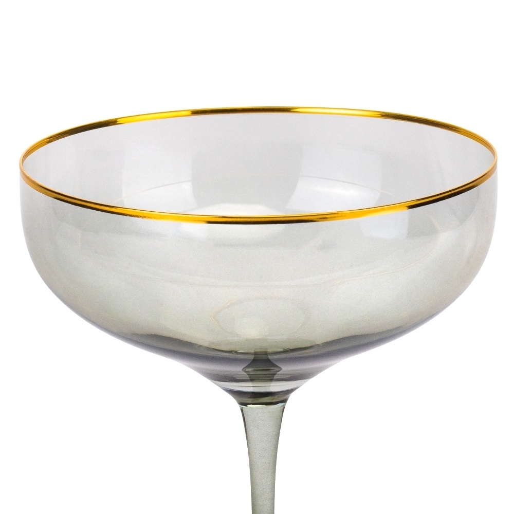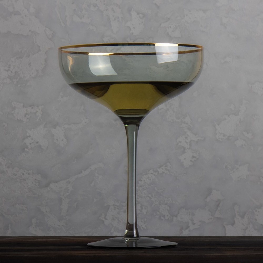 Бокал-шампанка стеклянный серый с золотой каймой Touch Of Gold 400 мл — это стильное сочетание винтажной формы и современного дизайна. Его изящная чаша в форме coupe отсылает к золотой эпохе светских приёмов, когда шампанское подавали в широких бокалах с тонкими стенками.